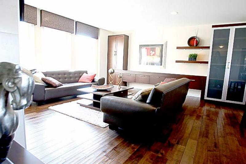 "Our interior designers really went to town, so what you see here is a unit with pretty much all the upgrades," said Loewen. "You get maple hardwoods, granite countertops, espresso maple cabinets, as well as (tan) ceramic tile. However, you also get two excellent standard features: a gas fireplace with ceramic tile surround and an eight-foot island in the kitchen. Eight-foot balcony doors -- they're absolutely huge -- are also standard."