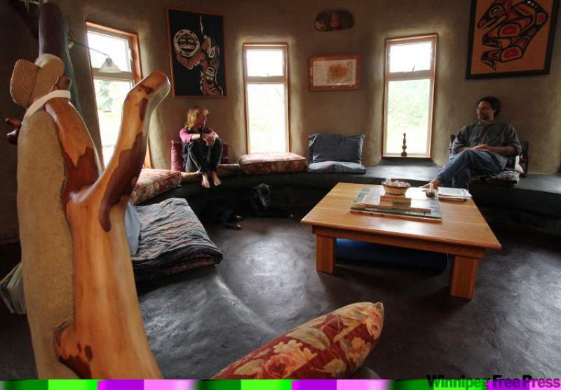 It took 90 yards of sand, 100 bales of straw, 40 yards of pumice, 25 litres of gas for a rototiller and two people working seven weeks to construct the lower wall. Eighty per cent of the wood used was recycled as were most of the plumbing and lighting fixtures.