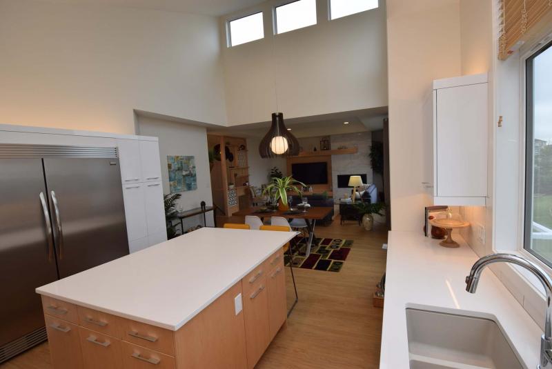 Then there’s the 40-foot-wide great room with its wealth of windows and sensational combination of natural and modern finishes.