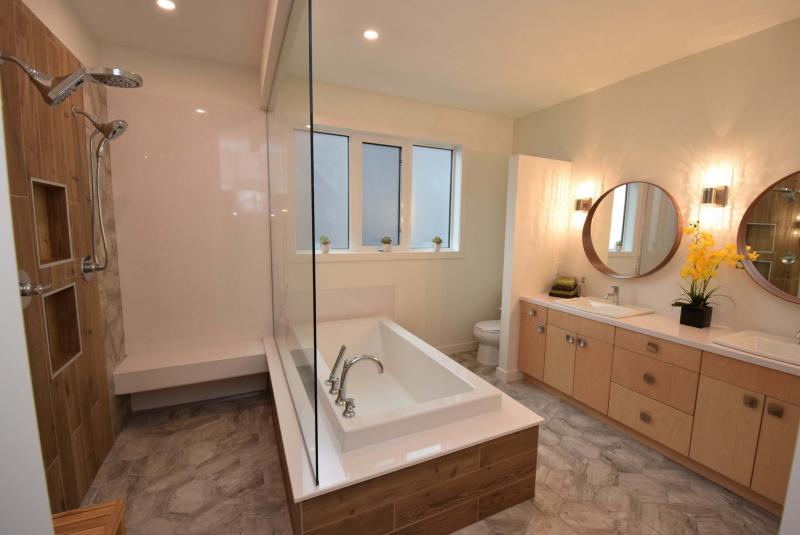 "Everyone has just loved the ensuite with its tropic-style walk-in shower, six-foot soaker tub set in woodgrain-look ceramic tile, hexagonal tile floor and a natural maple vanity with dual sinks set on a cultured quartz countertop," Milne says. "It’s a relaxing space that has a spa-like sauna feel."