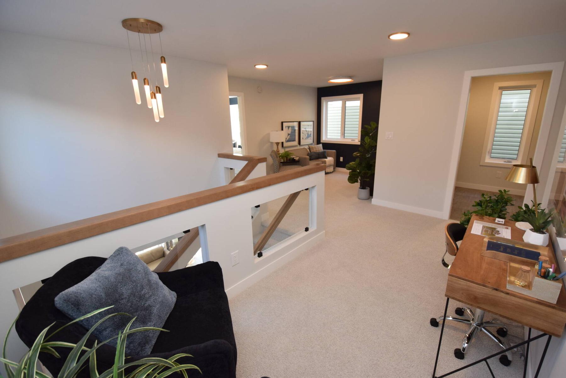 Turns out, the imaginative layout also promotes privacy. A large laundry room, four-piece bath and two big secondary bedrooms with walk-in closets were placed in a hallway to the right of the stairs, while the primary bedroom was set behind the loft to provide a distinct sense of seclusion.