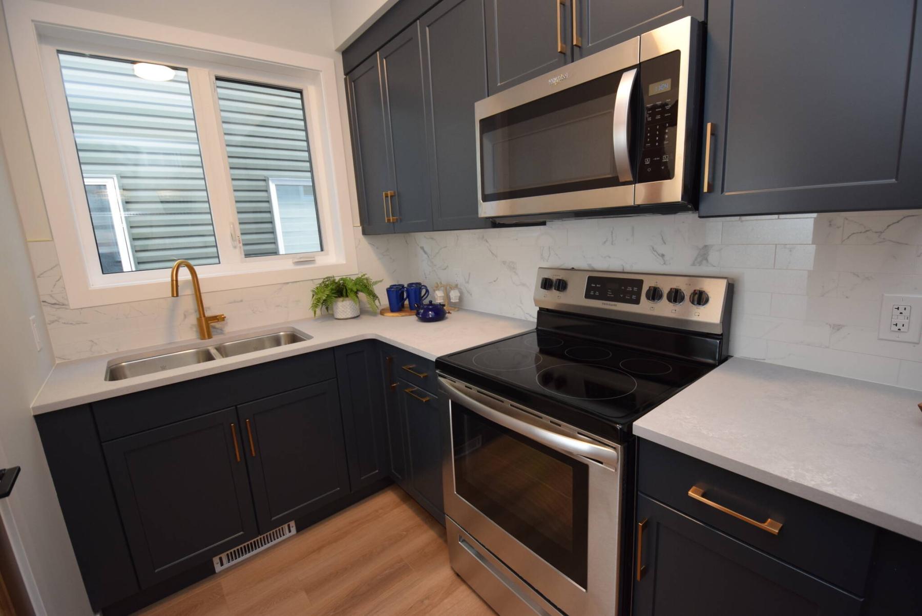 “It starts off with a fabulous island kitchen that’s anchored perfectly by a 10-foot-long island with seating for three. Matte grey quartz countertops go beautifully with a grey tile backsplash, and white and midnight blue cabinets with champagne bronze handles that match the lovely faucet. There’s just tons of space for more than one cook to move around and create.”