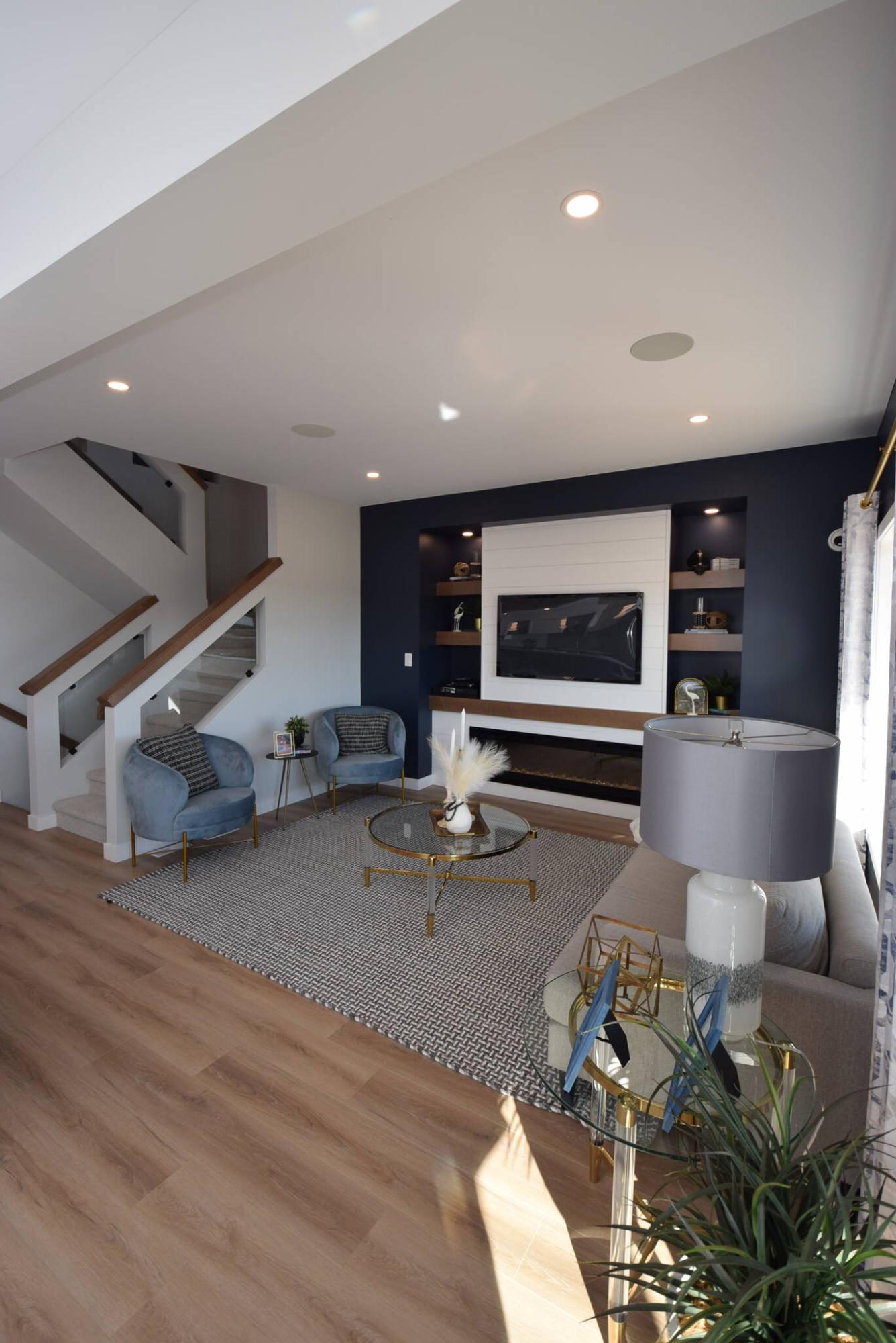 “What can you say — it just offers a perfect blend of design elements. Its linear electric fireplace adds wow factor, popping on a white shiplap backdrop. The oversized TV niche got the same shiplap background, while open maple shelving at either end adds style and utility. The midnight blue feature wall also helps create a rich, modern feel.”