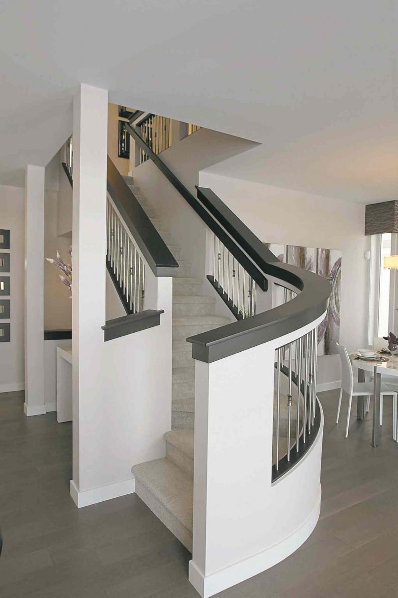 The next novel feature -- a welcome departure from the norm -- is a curved staircase that neatly divides the dining room from the kitchen. "Everyone who's been in the home has just loved it. Its espresso railing and capping contrasts with its (light taupe) walls and (taupe) engineered hardwoods. It gives the great room a real sense of style."