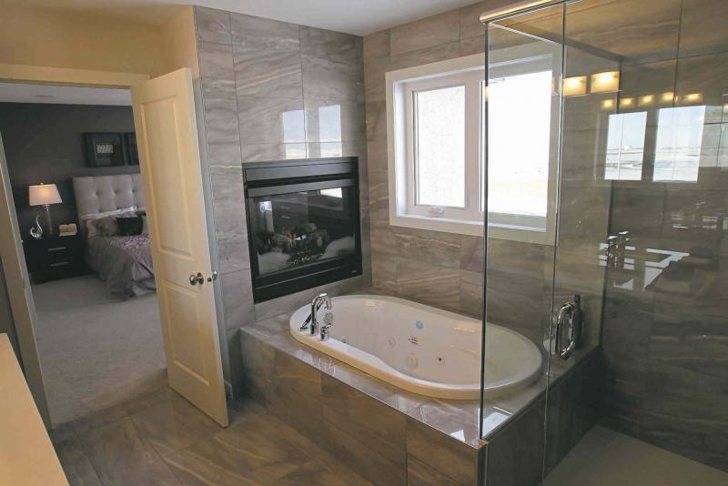 Then, there's the sumptuous ensuite. "It's not only spacious, but it's also very luxurious with the two-sided fireplace next to a six-foot jetted soaker tub set in (more taupe) tile," he added. "You also get a tile floor, custom (seamless) glass, tile shower, cappuccino vanity, white quartz countertop and dual sinks."
