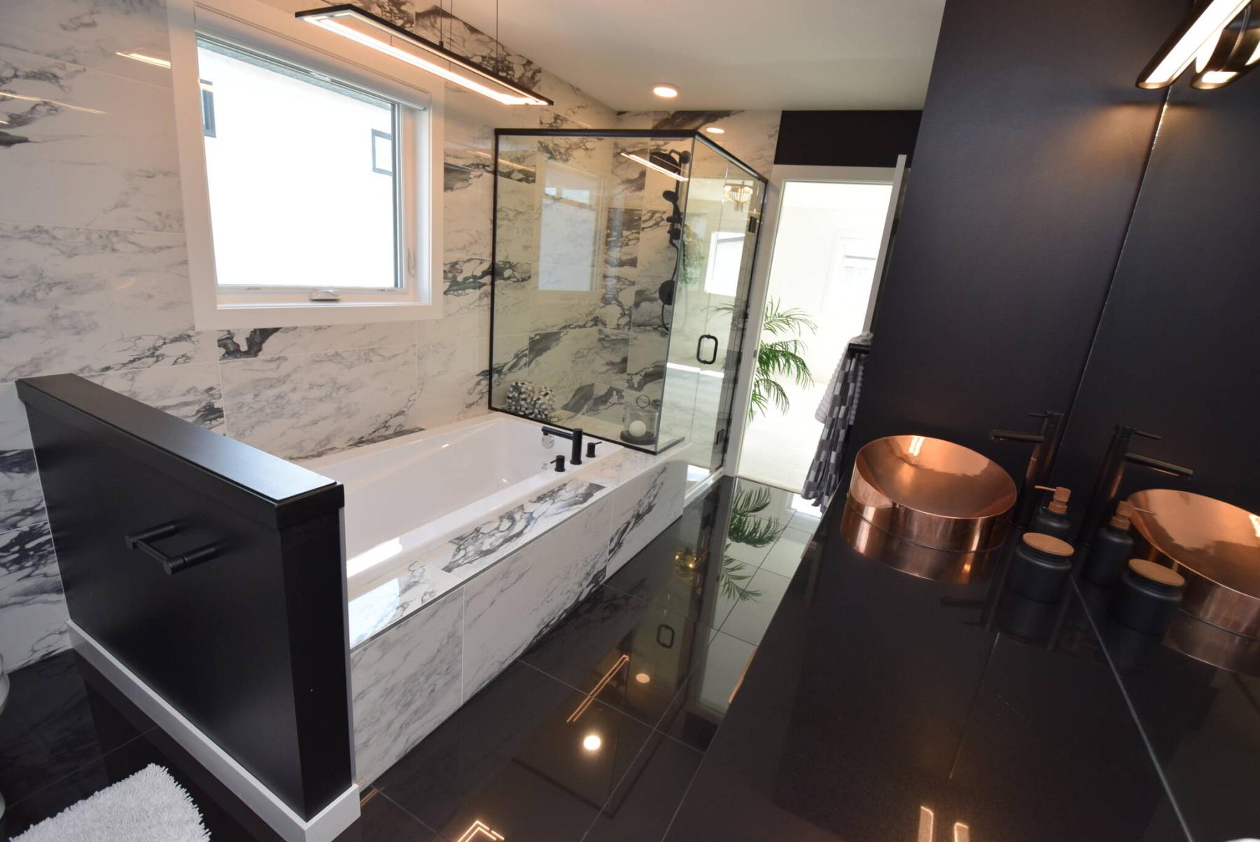 “Just look at the tiled wall behind the soaker tub and shower and the tiled feature in the shower that makes black fixtures stand out. And the vanity is spectacular, with dual bronze hammered metal sinks that pop on the black quartz countertop. The rose gold handles also go perfectly with the black vanity.”