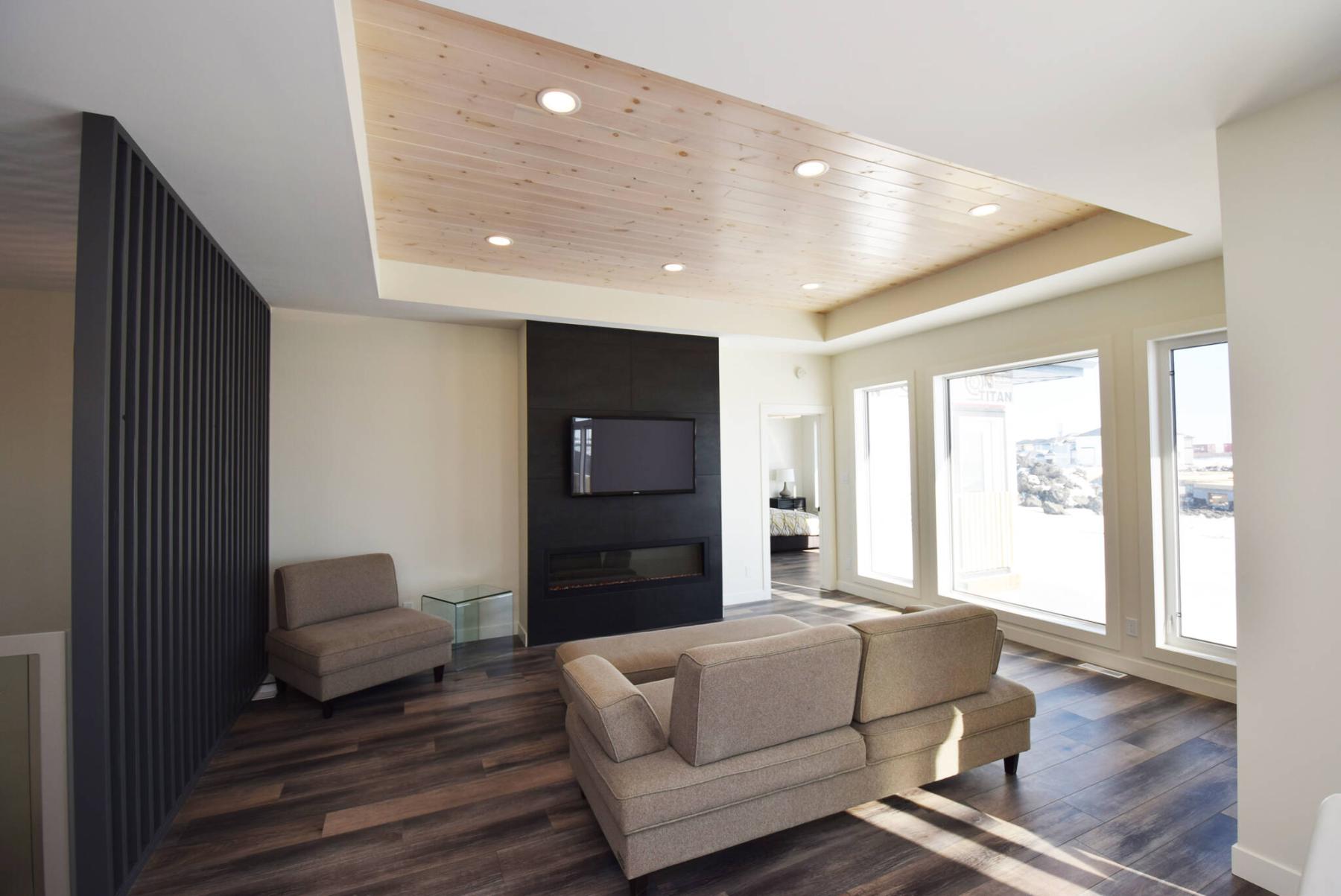 Defined subtly by a vertical slat feature wall and tray ceiling, the family room is a well-defined space that offers a perfect combination of natural light and inviting warmth. (Todd Lewys / Winnipeg Free Press)