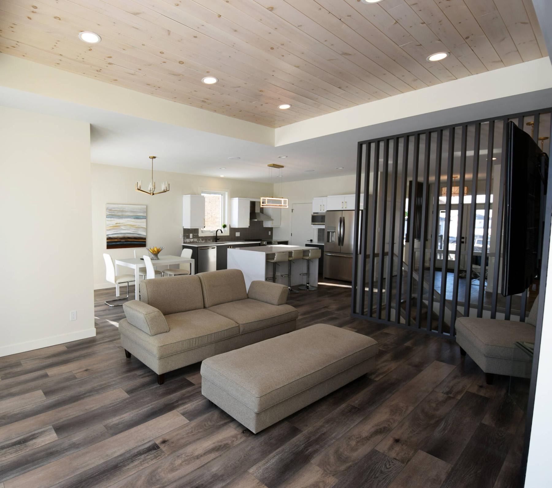 Warm wide plank vinyl flooring, a tray ceiling and a vertical slat feature wall add style, texture and warmth to the naturally bright main living area. (Todd Lewys / Winnipeg Free Press)