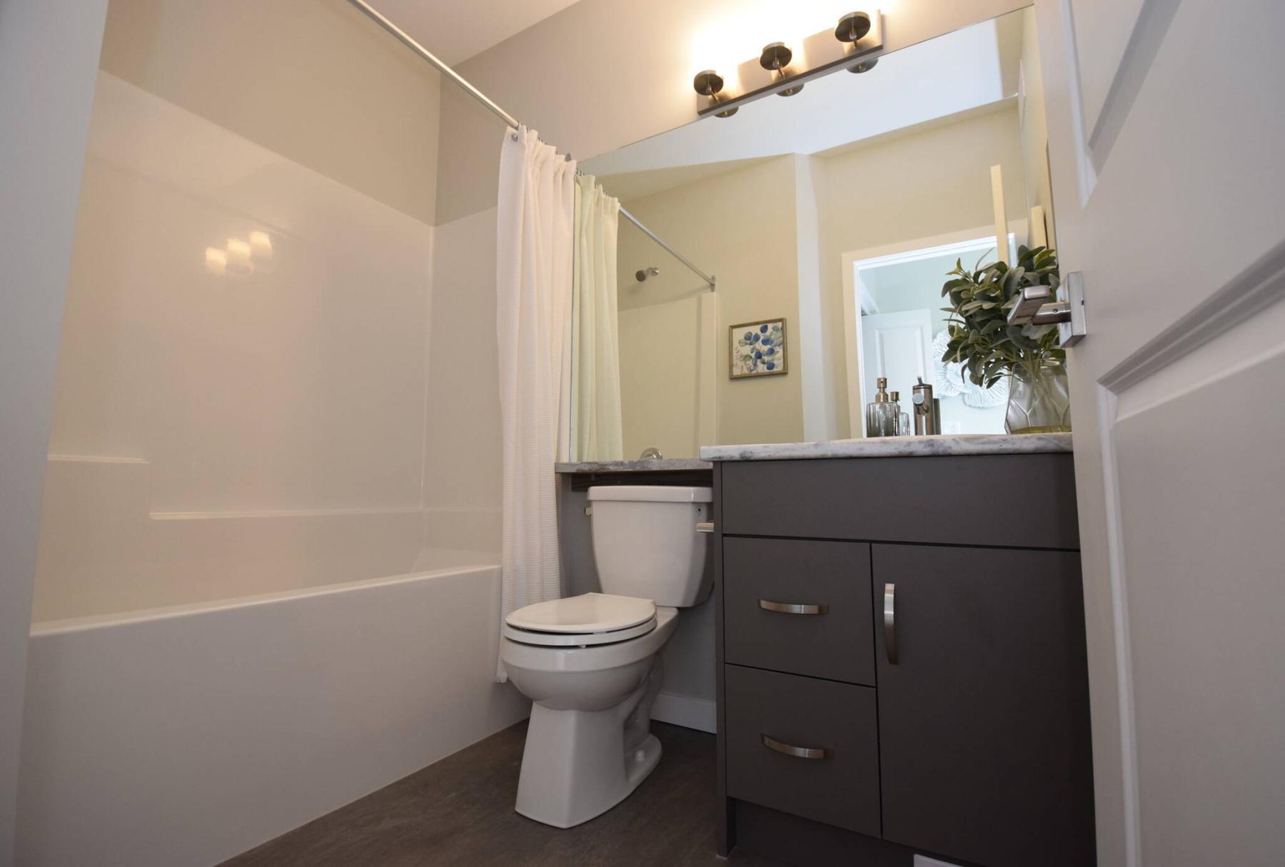 Kitchens come with off-white quartz countertops, white or dark (woodgrain-style) thermofoil cabinets, white or black tile backsplashes and stainless steel appliances.