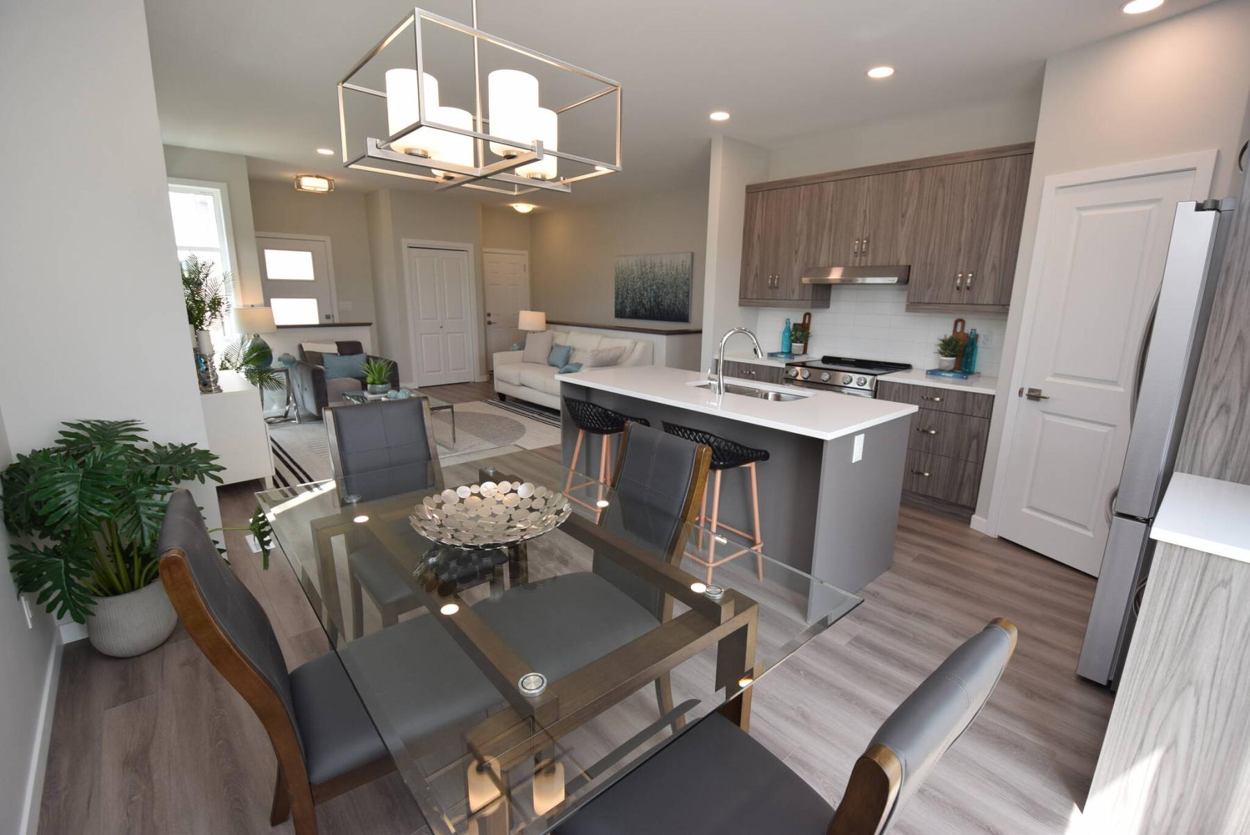 The flow from the living room into the kitchen and dining areas is fantastic at both 81-100 Grande Pointe Meadows Blvd. (top) and 29-100 Grande Pointe Meadows Blvd. (bottom).