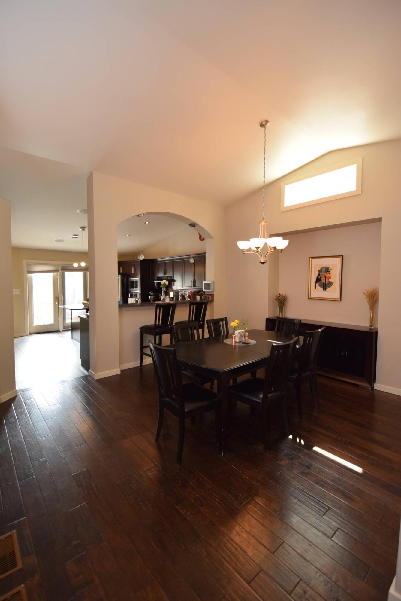 “I’d say it’s more of a combination of open-concept and traditional,” she says. “Each space is separate, with a living room at the front of the home. It offers a vaulted ceiling, large picture window and an electric fireplace set in a taupe cultured stone surround and a TV niche above.”