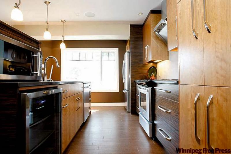 Meanwhile, the design of the main level -- conceived by Contant and his business partner Brad Sveinson -- is as contemporary as you can get: an open-concept kitchen with an arched, pillared entrance to an island kitchen, the island comprised of an engineered, striped balsam wood that mimics zebra wood. The kitchen is then finished off in rich fashion with plank-style cork flooring and gorgeous cherry cabinetry (by Visions).