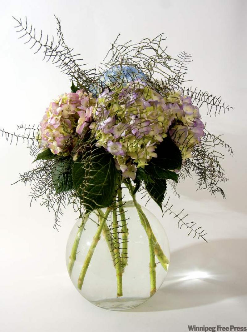 Other affordable suggestions from Minnett: Choose three hydrangea stems (about $5 each) and place them in three containers of different heights and shapes. Using differing heights gives the arrangement more movement: the effect is nice.