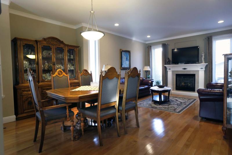 "This home has a wide-open, modern floor plan with nine-foot ceiling, pot lights, crown moulding, large windows, hardwood floors and a large family room with gas fireplace (with tan tile surround/hearth and white mantel/trim)," Dale says.