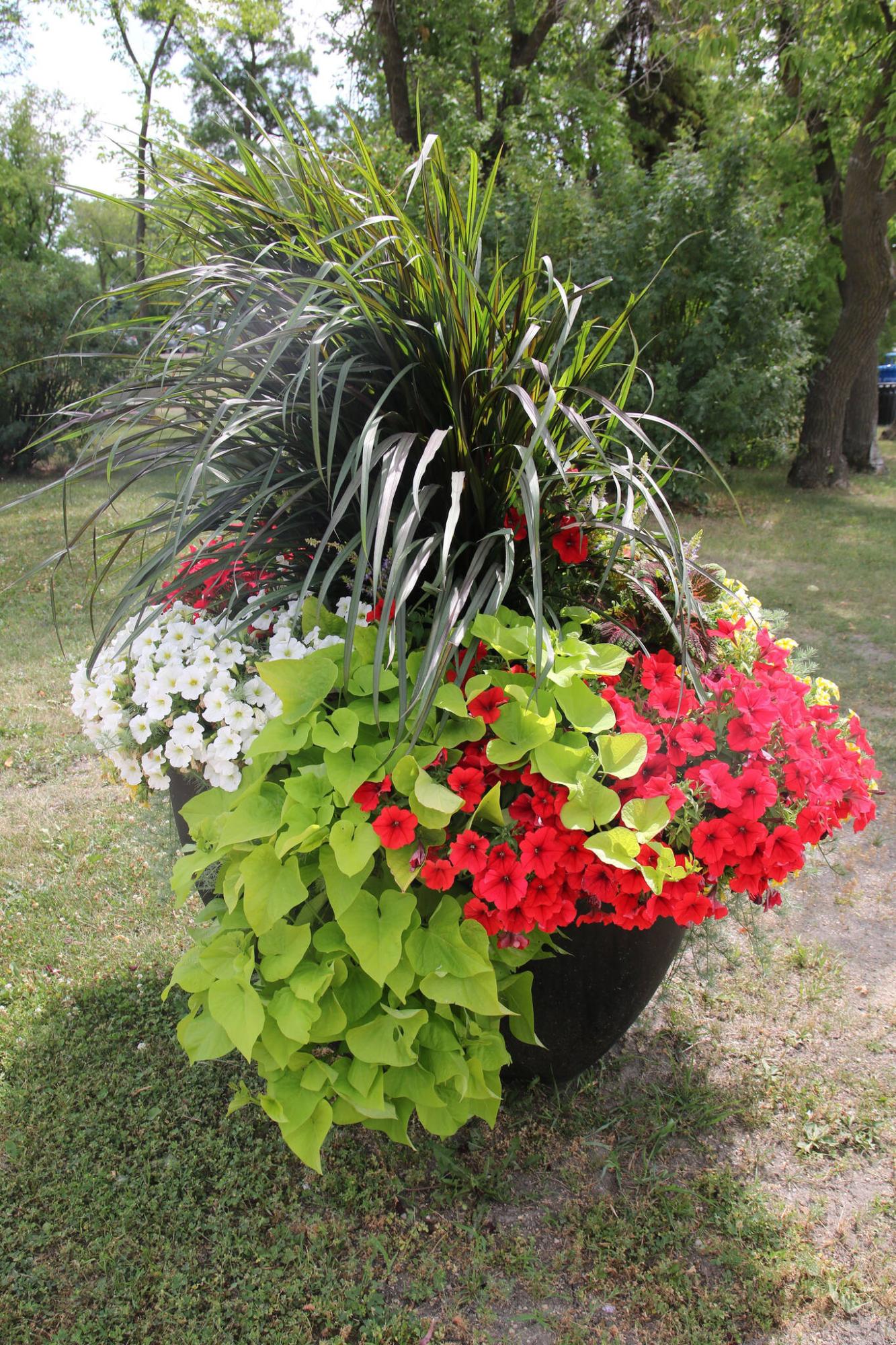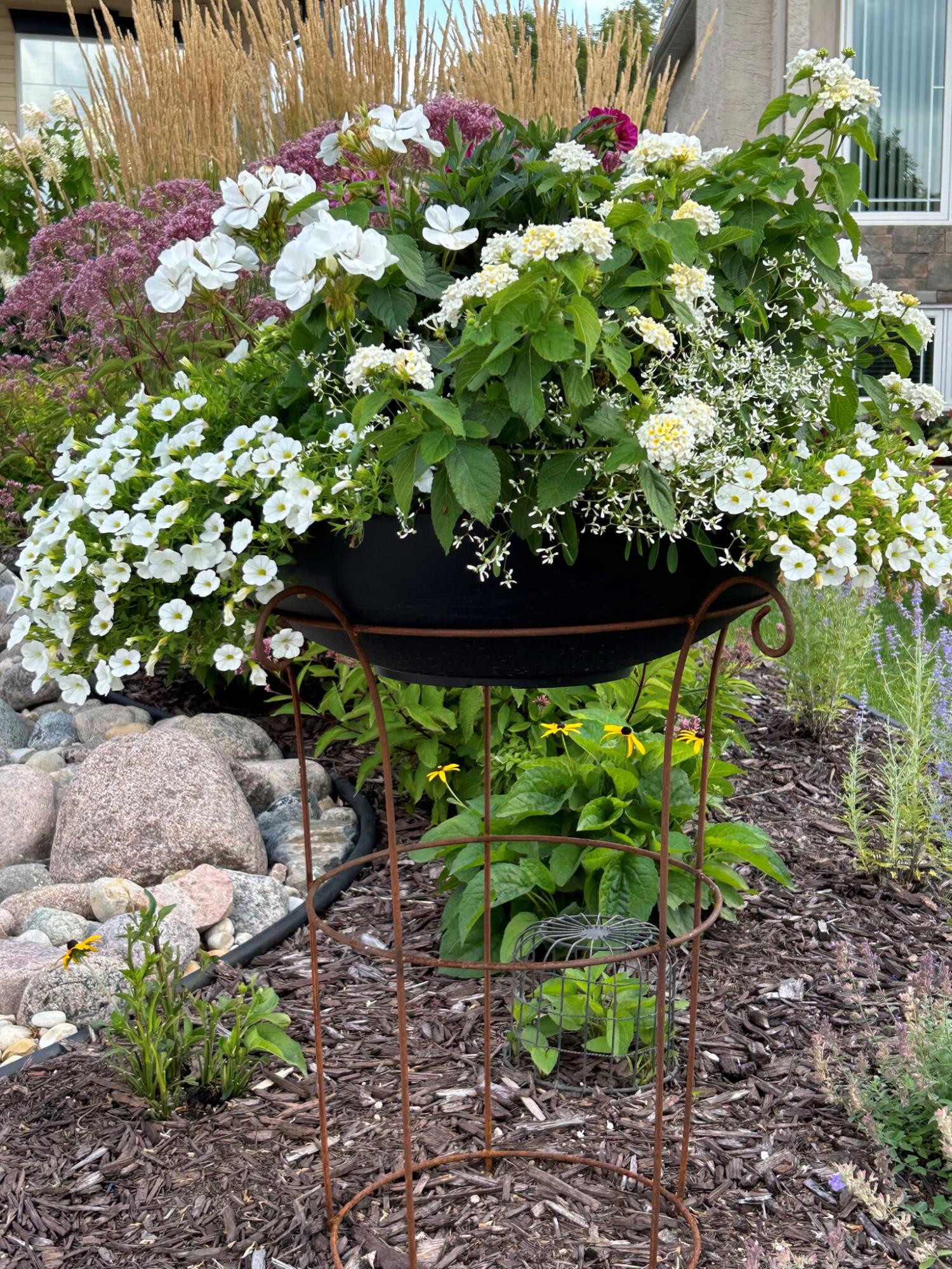 Veradek’s series such as Pure, Block and Mason have a contemporary design esthetic and are available in black or white, two tones which are especially popular right now. Last summer I admired a black Mason Lane bowl in a homeowner’s garden in St. Vital. Made from patented stone-plastic composite, the Mason series is impact- and crack-resistant with a fade- and scratch-resistant texture. Susan Southern filled her Mason bowl with geraniums, Diamond euphorbia and verbena. She elevated her design by setting her planter into a steel plant support. The Mason bowl would look equally stunning on a pedestal or placed on a front step or deck.