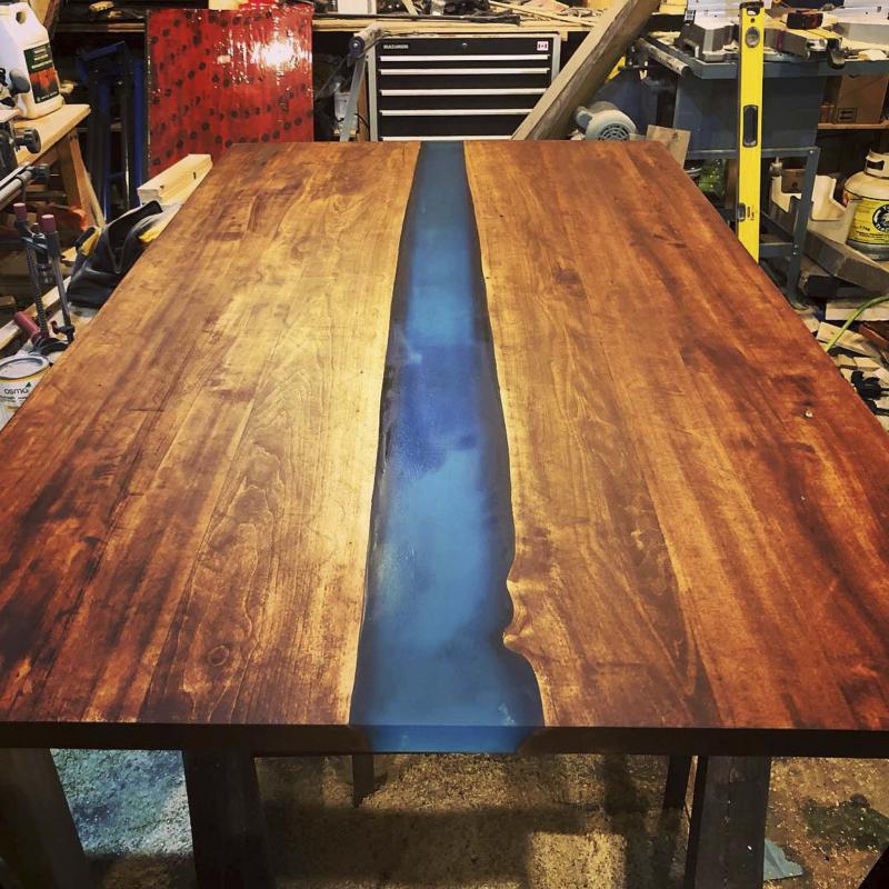 Essentially, a river table has a tabletop which combines esthetically pleasing timber with an artistic, meandering band of often semi-translucent resin, which when completed, resembles a river running through a landscape.