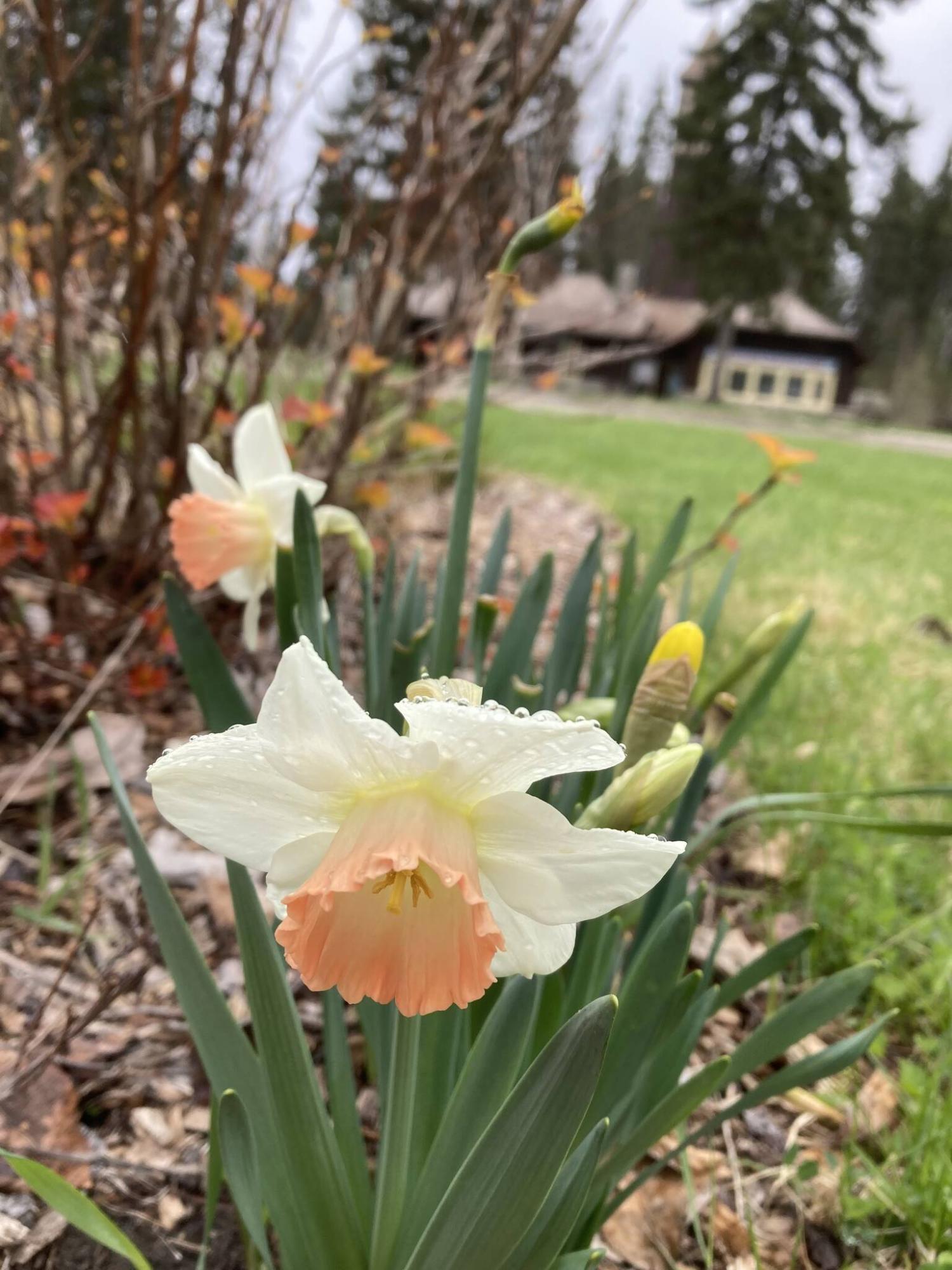 Lyndon is partial to daffodils, especially varieties with white flowers. In his first year as head gardener at RMNP, he planted Narcissus poeticus, also known as the poet’s daffodil or pheasant’s eye. “It is a small, elegant daffodil with white flowers and an orange eye. Last spring they were like a twinkly blanket of white stars through the gardens early in the year.” Penner says there are lots of so-called pink daffodils, but they are actually soft salmon or have coral and peachy tones. Narcissus Pink Pride, for example, produces white petals and a pastel apricot cup in the centre. Penner is looking forward to seeing British Gamble daffodils in bloom this spring. “The flowers are a bit ruffled, and the colour is a soft peachy pink.”