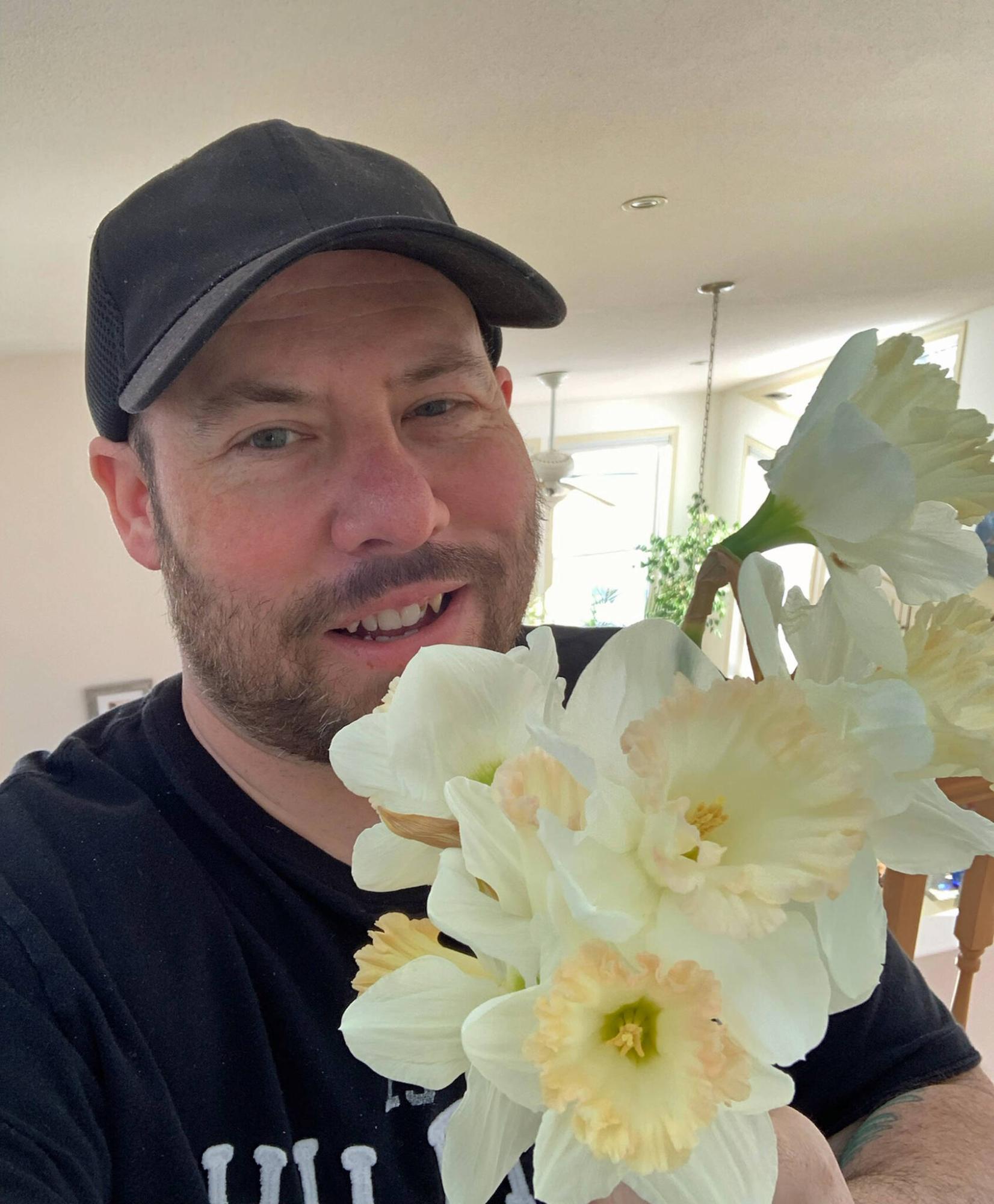 Lyndon Penner, head gardener at Riding Mountain National Park, in his kitchen with potted daffodils in full bloom.