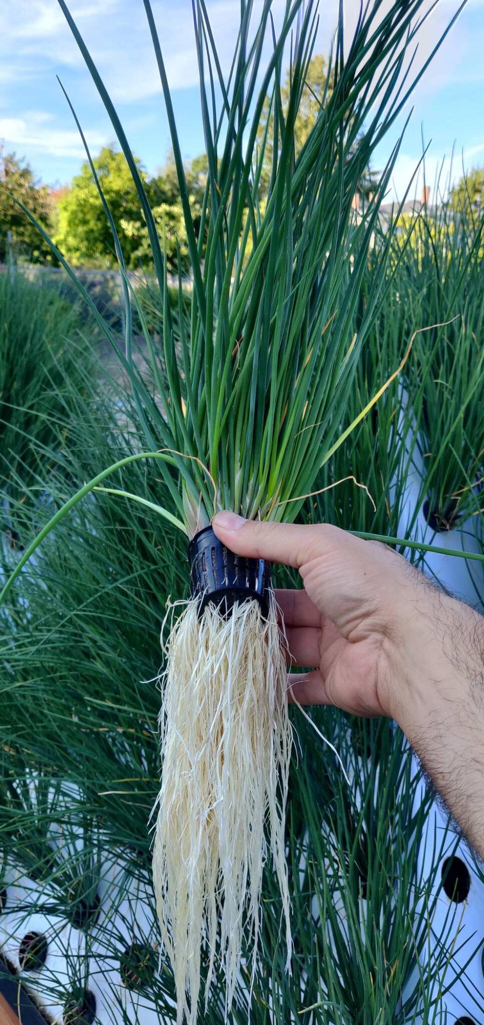 Chives grow bigger and faster with the aeroponic method and produce a healthier root system.