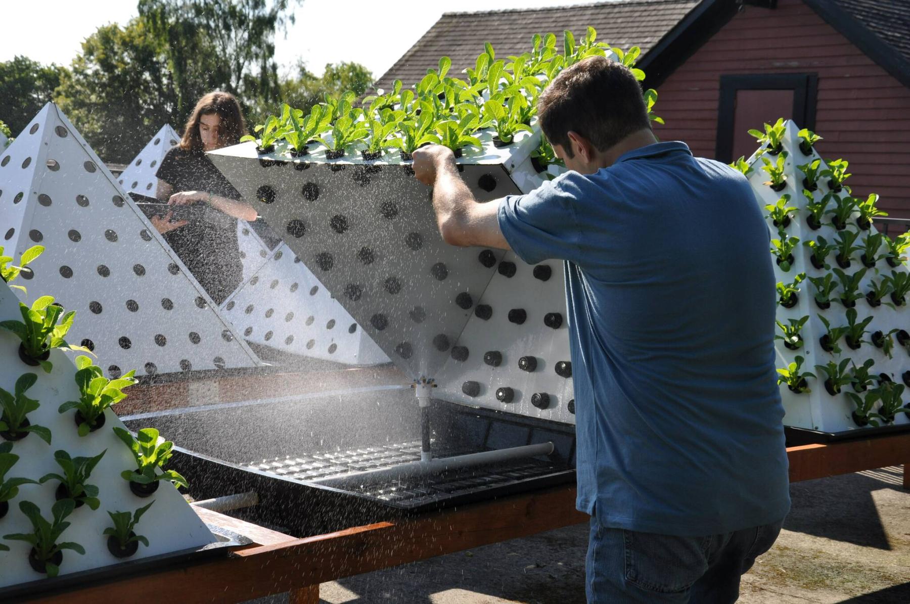 How does the aeroponic system work? Briefly, seedlings are planted into net pots that fit into the pyramid. A mister inside the pyramid sprays the roots of the seedlings every 30 minutes with recycled water and nutrients. Nutrient and pH levels must be monitored twice daily. Aeroponic farming is less water-intensive than traditional farming and because the root systems of the plants are constantly exposed to oxygen, the plants grow bigger and faster than in traditional agriculture and produce higher yields. “One advantage of aeroponics,” says Murr, “is that when you spray nutrient water at the root level, you are also providing more oxygen at the root level. The healthier the root structure, the healthier the plant.” It is essential to adequately maintain water tanks, filters, and misters.