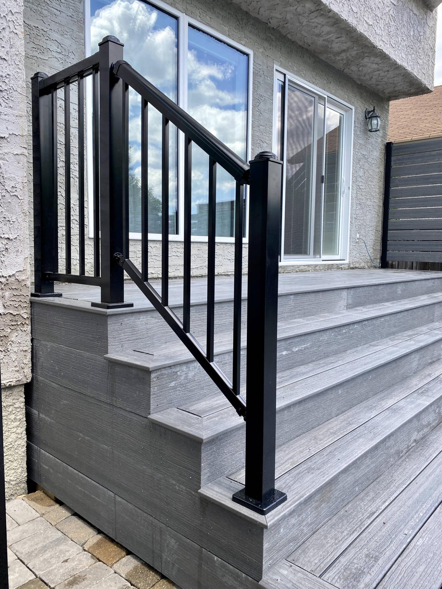 A short run of black aluminum railing is added along the close side of the deck at the stairs.