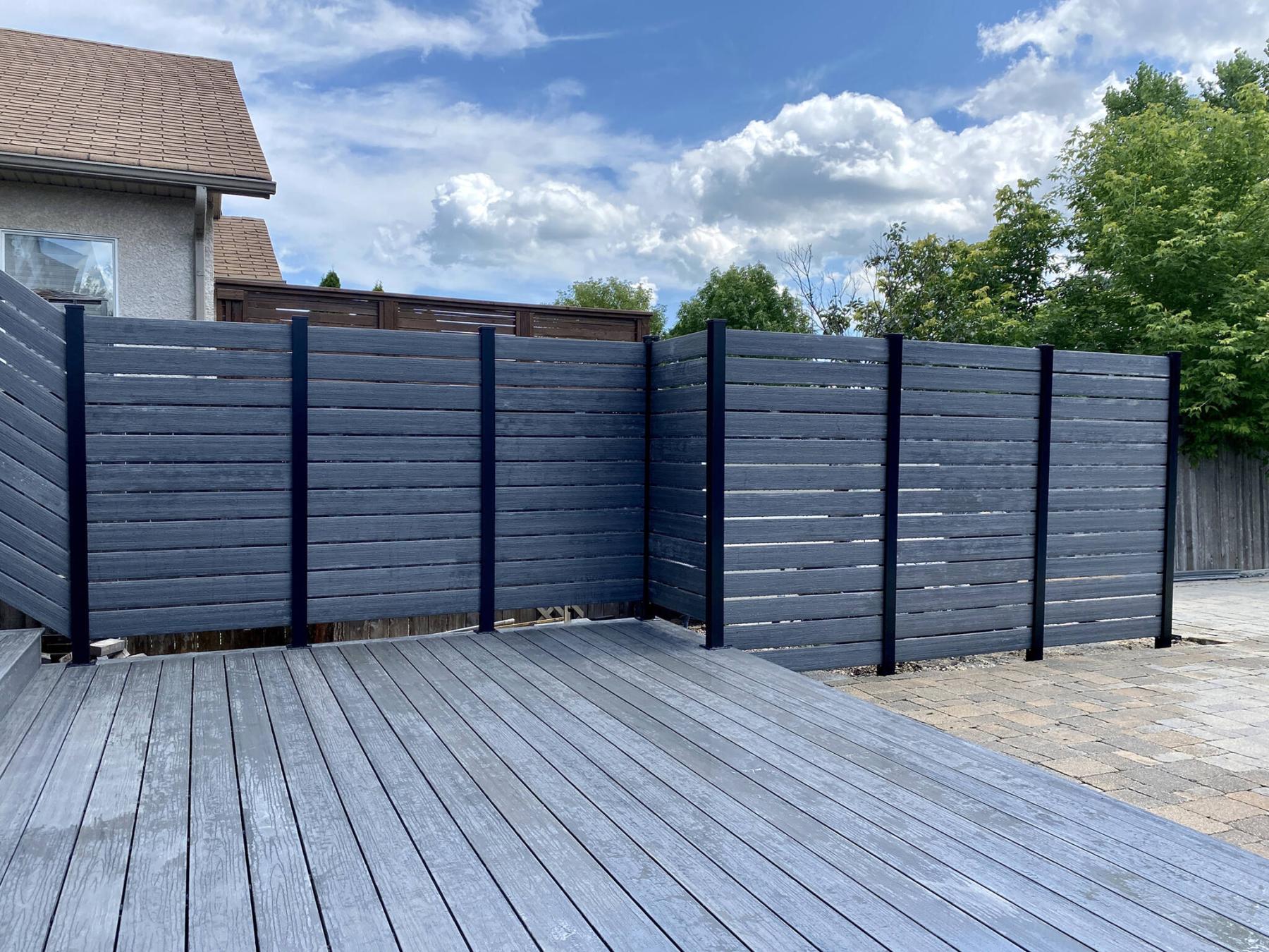 When glancing back at the newly upgraded deck and privacy wall from the yard, both the grey tone of the decking and black posts of the railing and privacy wall provide an elegant and refined esthetic to the backyard and pool area. And once the black pergola is repositioned atop the lower deck tier, the entire space will offer a welcoming uniformity and sheltered lounging area while enjoying the pool under the hot summer sun. A huge improvement!