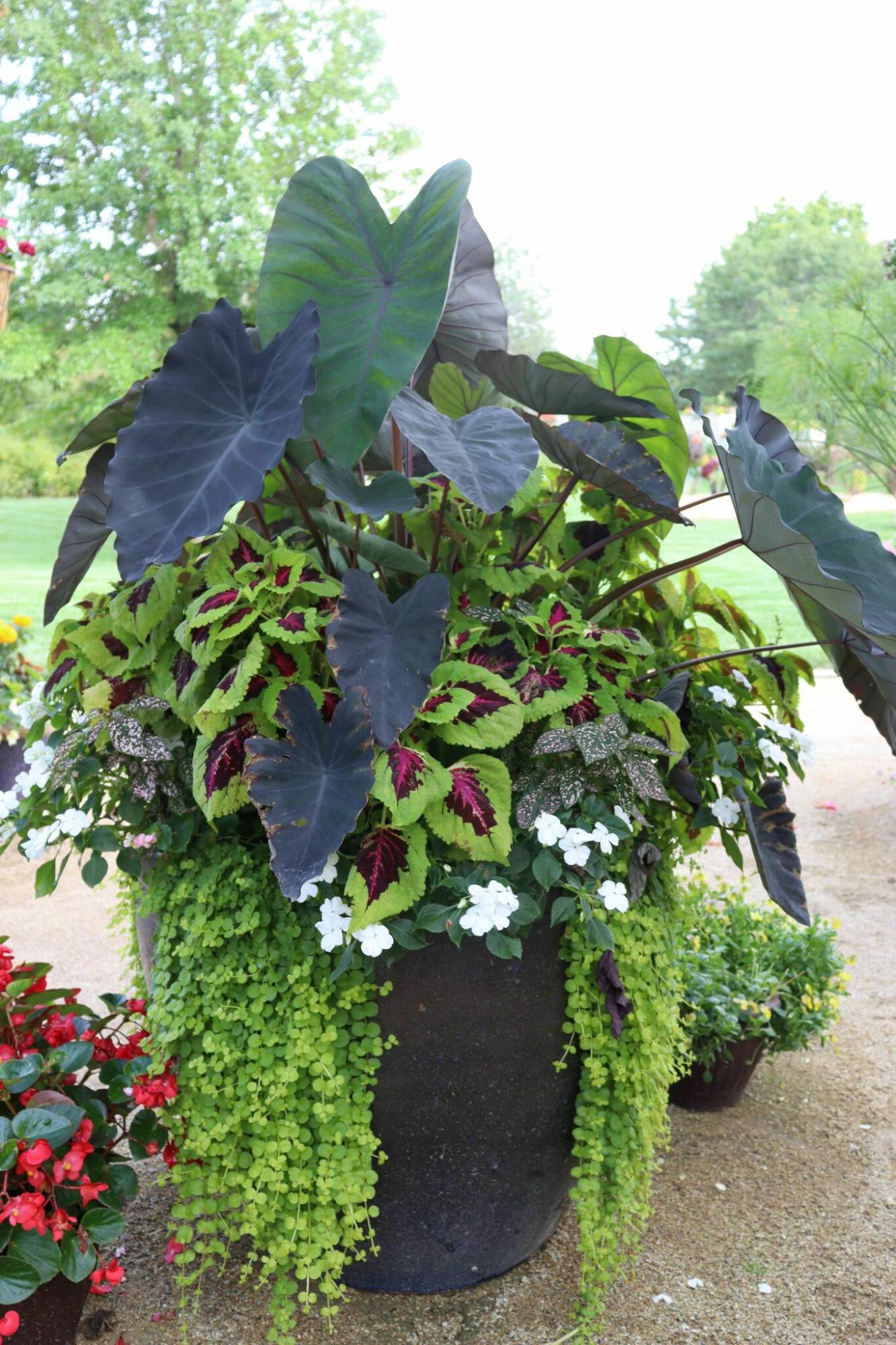 To achieve scale, match large plants with large containers, as in this one filled with colocasia, coleus, polka dot plant and lysimachia.