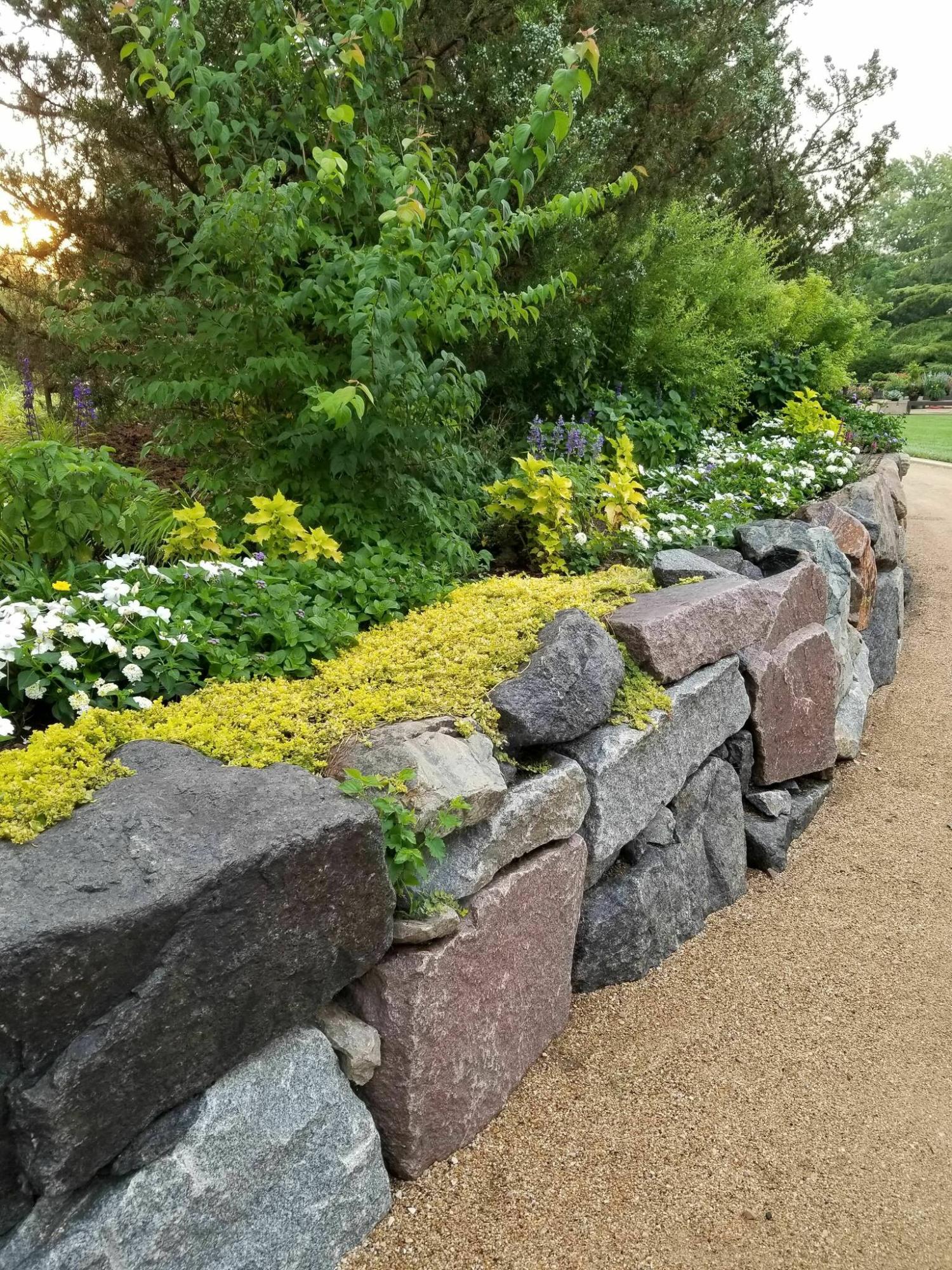 Stacked stone walls at the gardens at Ball have an old world charm and an attractive plant selection.