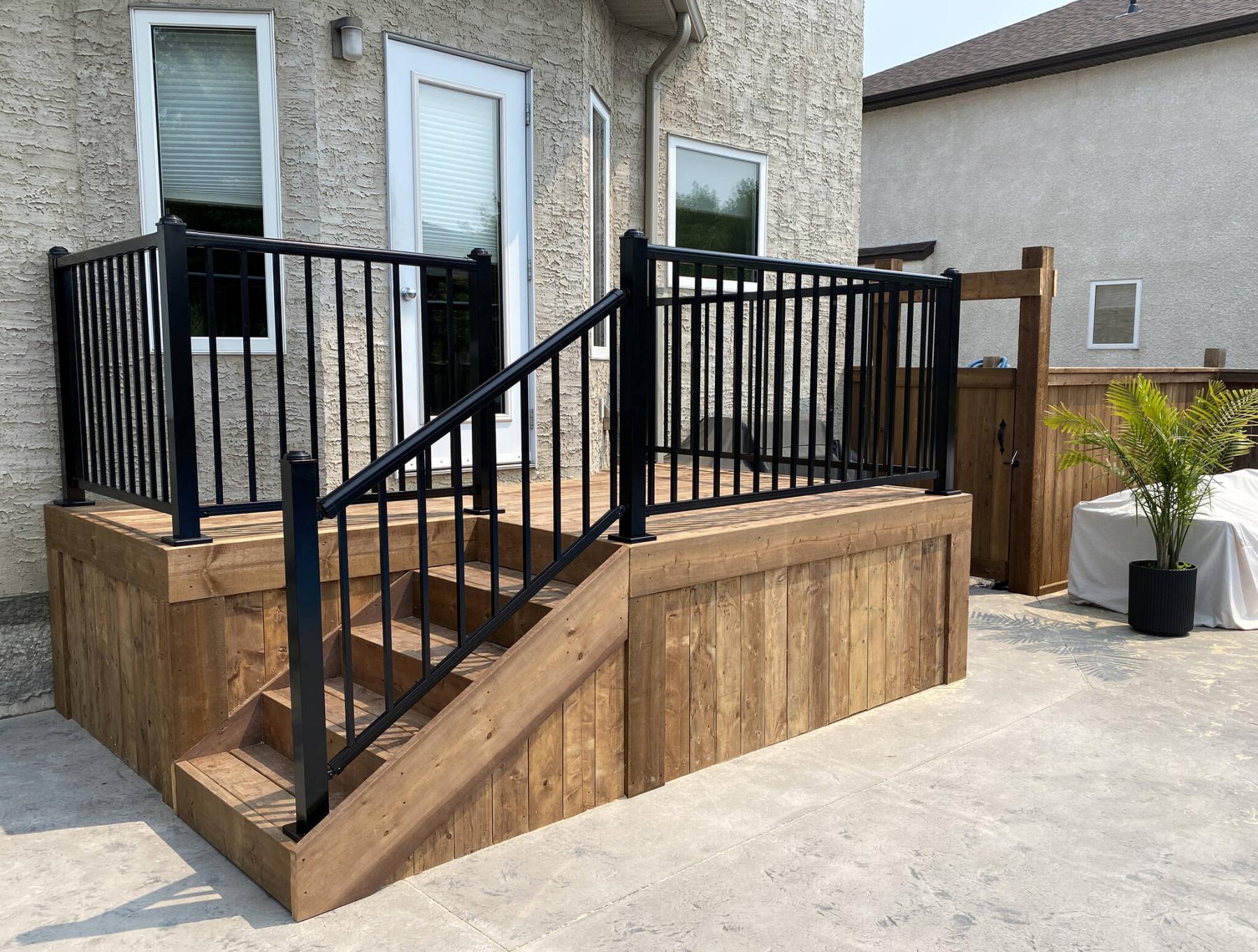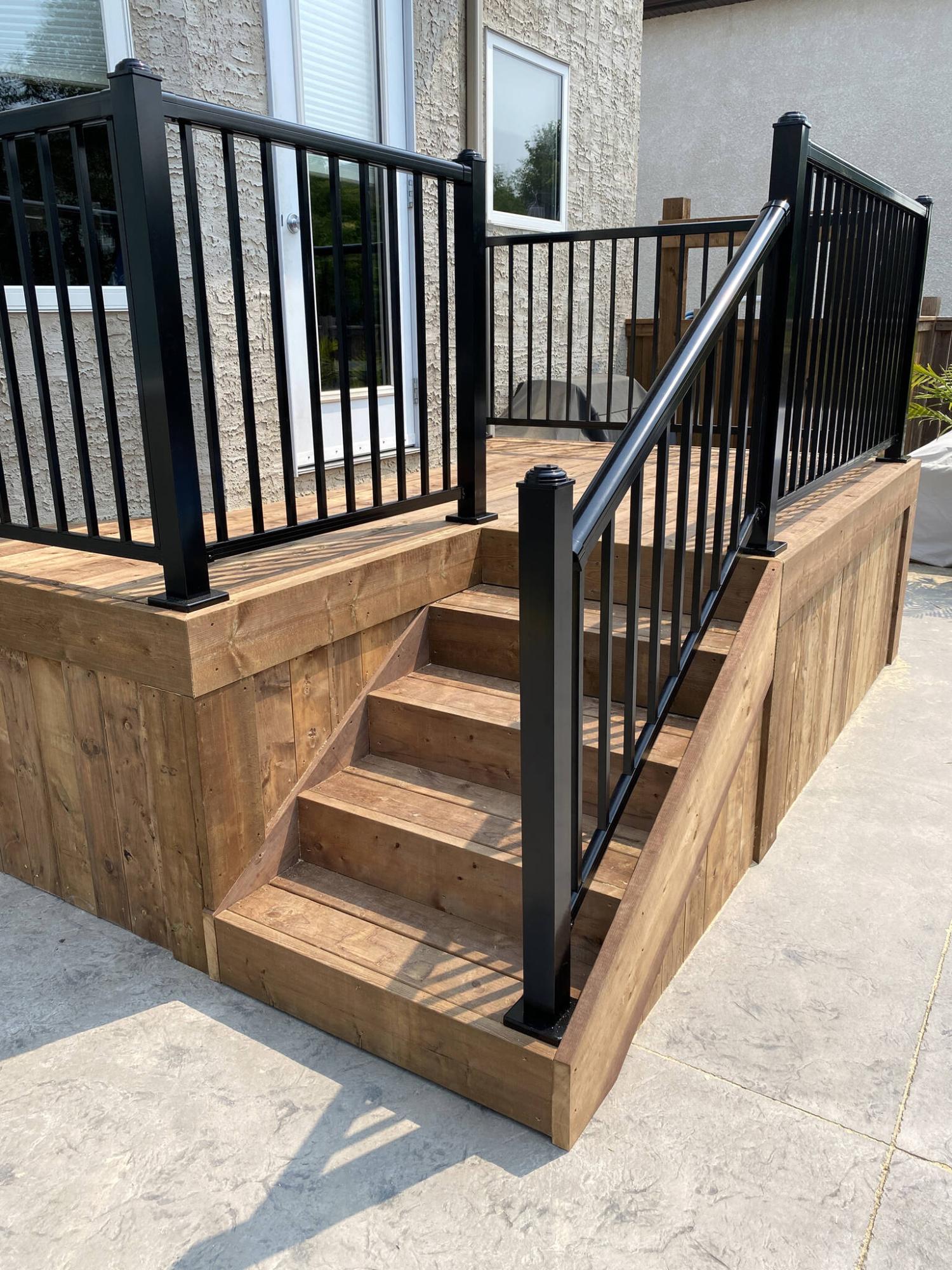 A treated lumber deck with black railing was positioned adjacent to an in-ground pool.