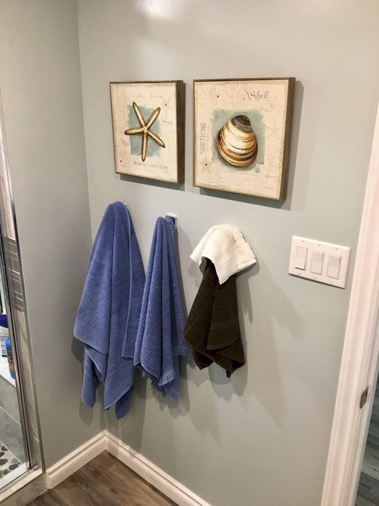 The tucked in area beside the shower stall build-out provides the perfect location for towel hooks.