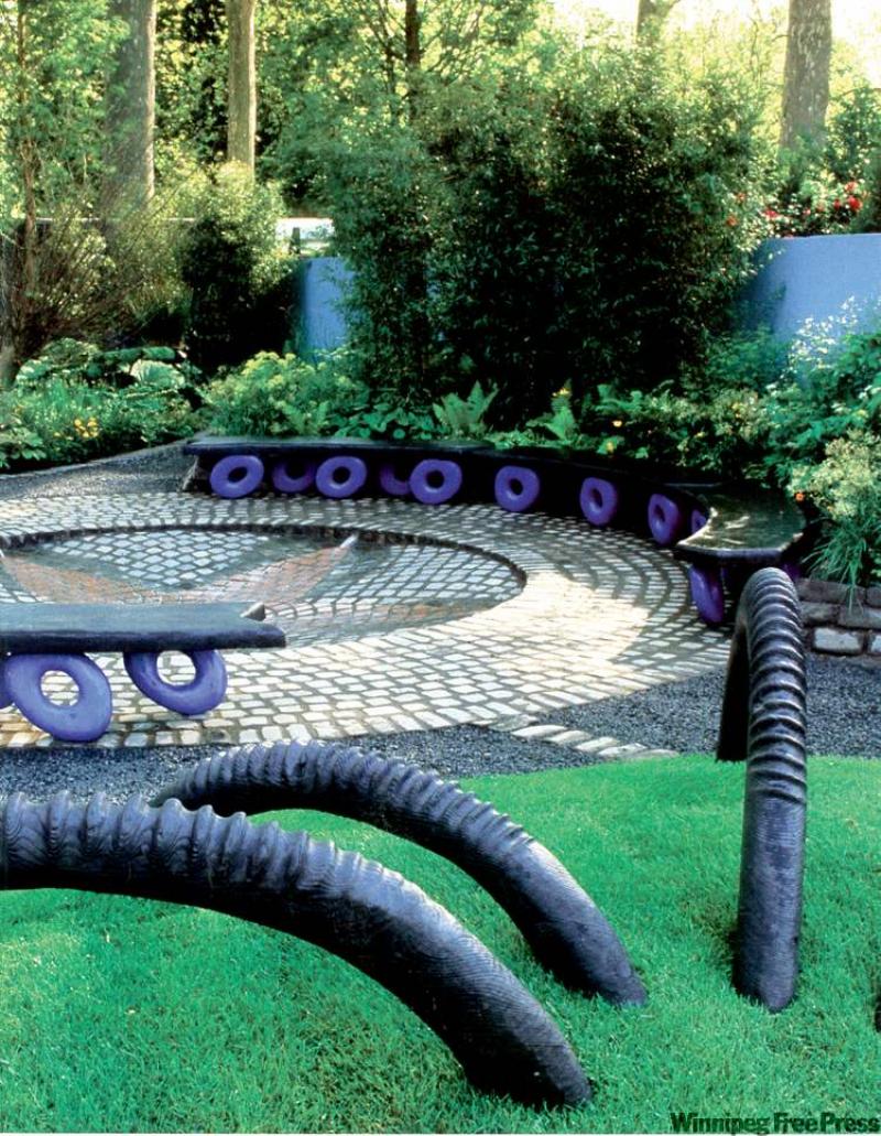 In Best Garden Design, there's the Oceanico Garden from 2008, with its whirling, white, butterfly-wing-like umbrella canopies that hover over a planting of sculptural boxwood balls interplanted with Mexican feather grass and purple alliums. In the evening, the white netting of the canopies is turned purple by strategically placed spotlights on the ground. The effect is to transform the garden into a fantasy world that would be ideal for a party.