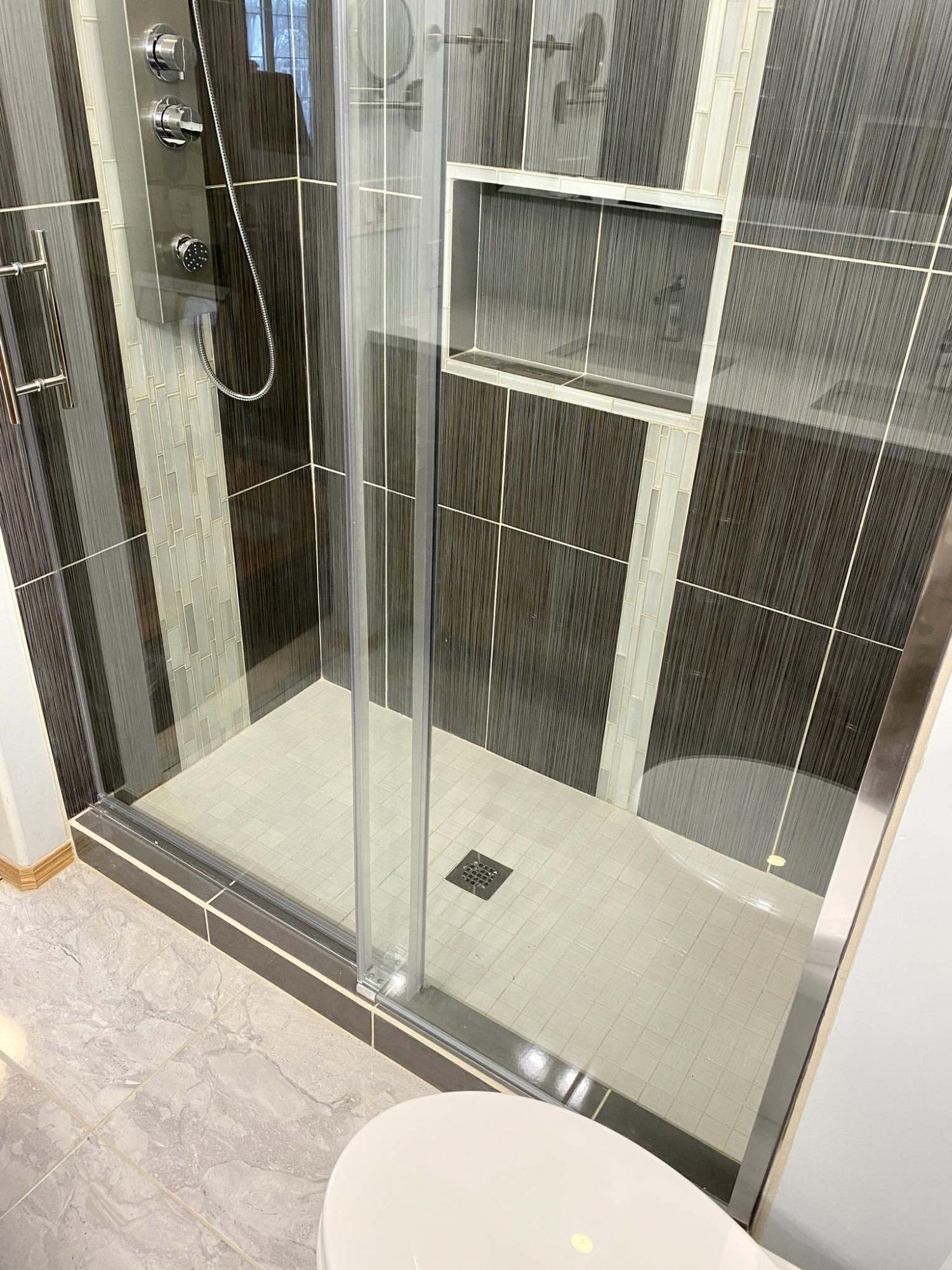 With the vanity in place, the toilet was set into position. The shower column was connected to the water feeds strategically centred within the decorative tiled stripe and mounted to the wall. The sliding glass shower door was then installed atop the shower curb, whereby the static panel is affixed to the partial wall protruding from the back wall, with the glass slider providing access near the shower column on the front wall. Every glass seam was then sealed with an ultra-clear silicone. The baseboards were installed throughout, and received the same clear silicone along the floor and top edge as well.