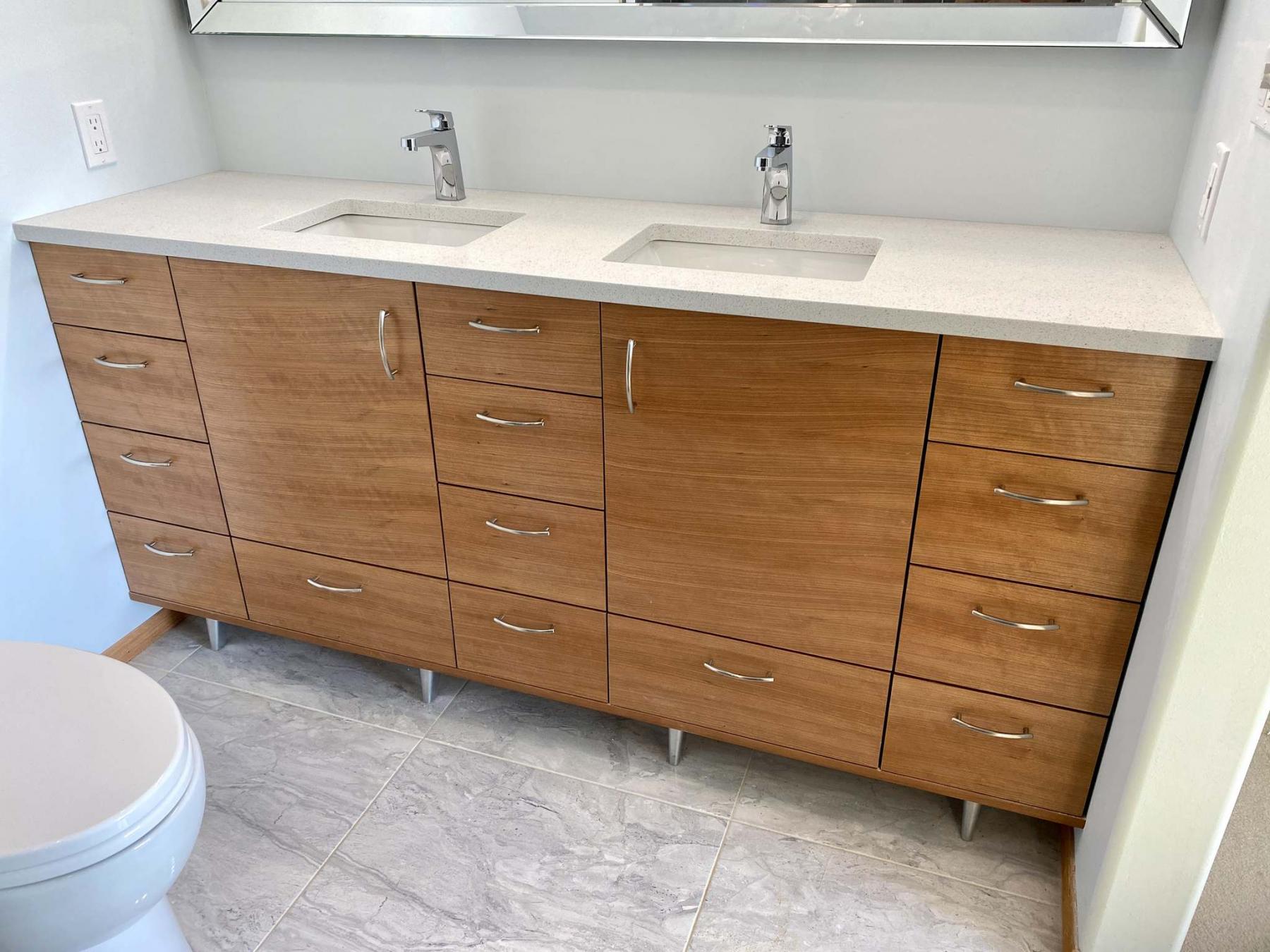 Once the cherry-stained custom vanity was delivered and subsequently set into position, the cabinetry was levelled and affixed to the back wall. The rough plumbing for drains, and water feed shutoffs were installed before the custom quartz countertop provided by Solid Stone was installed, along with two undermount white ceramic sinks. The faucets were then secured to the counter, and the water feeds and traps for each sink were also connected. Simple yet classy brushed nickel handles were carefully mounted to the doors and drawers.