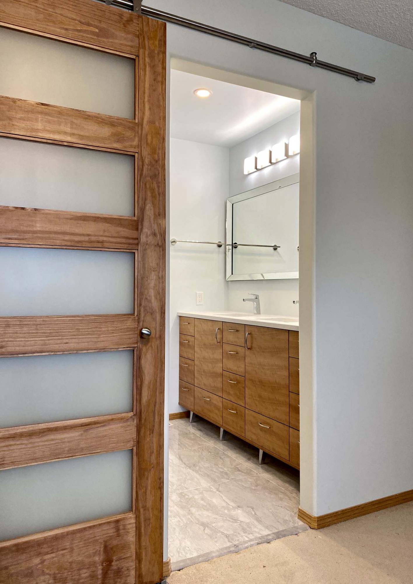 Barn-style sliding doors were stained cherry to match the bedroom furniture and bathroom vanity.