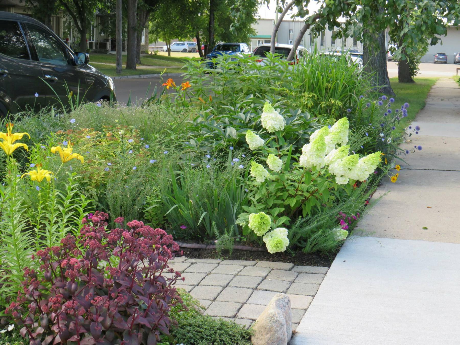 On the other side of the pedestrian sidewalk is Bryan’s lush boulevard garden filled with perennials, ornamental grasses, mini edible peppers, and a gorgeous Moonrock hydrangea.