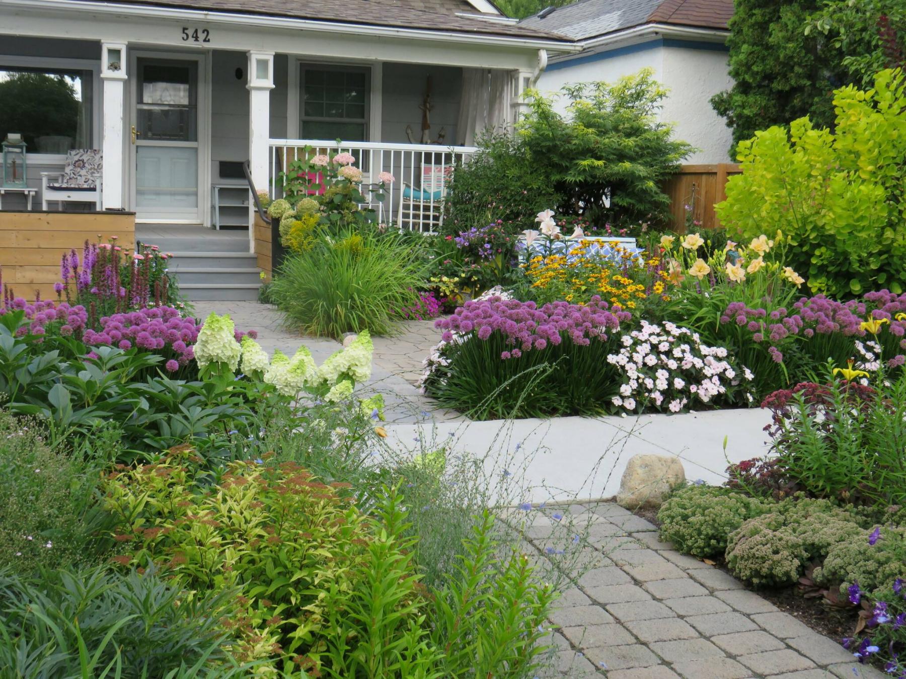 The length and width of Bryan’s stunning front yard garden is planted with flowering perennials and shrubs that offer a succession of blooms from spring to fall. The entrance to the garden, adjacent to the pedestrian sidewalk, is framed by a colourful border densely planted with Millenium ornamental allium. Interspersed are lilies, daylilies, false sunflower, liatris, and Sunpatiens. The stretch of border is anchored on one side of the front yard by Royal Purple smoke bush and Golden Spirit smoke bush and on the opposite side by a dramatic combination of tall Martagon lilies, Veronicastrum Culver’s root, dahlias, and Canna Australia.