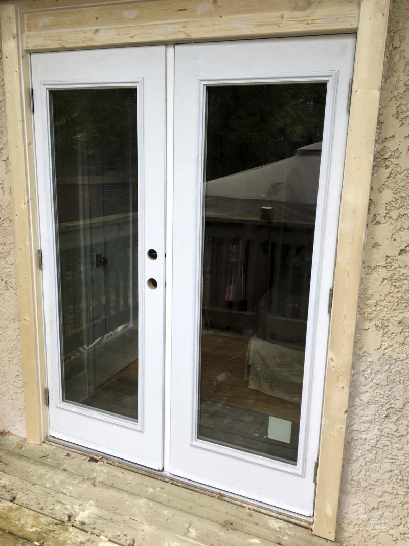 showcases finished install of double patio door at Rena Semenko’s home with appropriate trim (exterior)