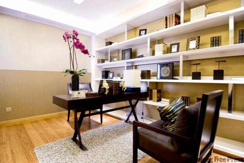 After the shelving is installed, all you need to do is to find a great desk and chair set and additional seating if desired. The contemporary pieces in our feature room are rich looking which gives the home office an appearance of being established and having integrity. If you have clients that visit your home office, this furniture sends the right message.