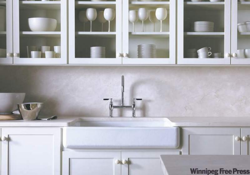 As you can see from our feature photos, courtesy of Kohler, a white décor doesn't have to be stark or boring. The lovely kitchen with glass-fronted cabinets has lots of subtle visual interest that does not assault the senses.