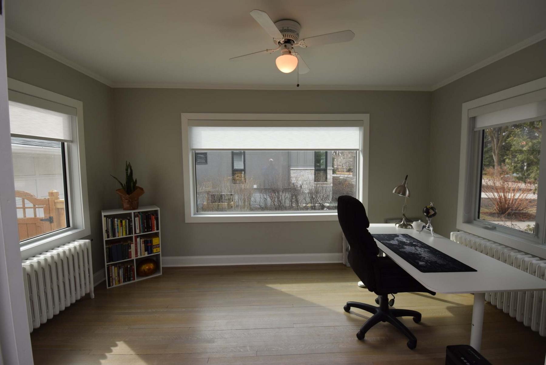 Situated off the living room, the spacious sunroom makes for a perfect office.