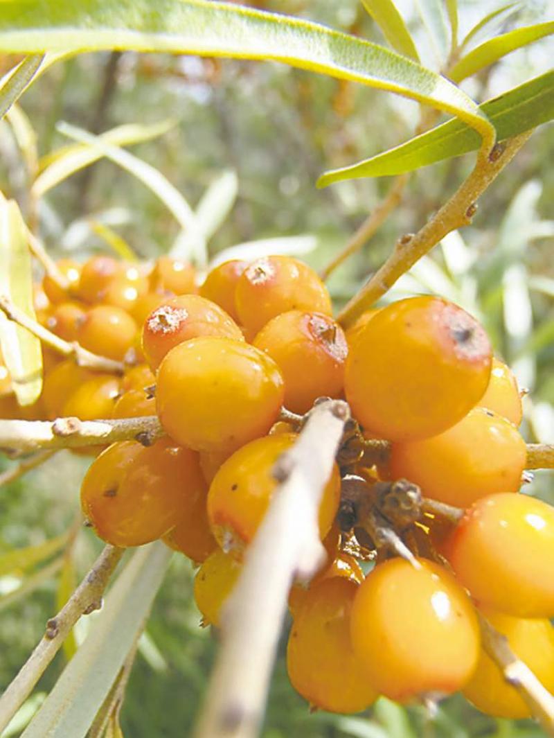 Seabuckthorn was used for centuries in Eurasia for food and medicinal purposes. For example, Seabuckthorn products (such as skin cream and juice) were utilized by Soviet cosmonauts during the 1960's space race to reduce the stress of extended space missions. Seabuckthorn juice is claimed to be the first fruit juice in space. This fruit was introduced to Canada as an ornamental and shelterbelt shrub and has only recently been planted in orchards for commercial production across the Prairies and in Quebec. The bright orange berries have an extremely tart, unique taste and are typically too tart for fresh eating. Knowing that half a cup of berries provides 350 per cent of the recommended daily vitamin C intake, may make it more palatable! Some find it enjoyable as a jelly or juice puree tempered with apple juice. The leaves can be used fresh or dried for tea, which has a slight brown colour and smooth flavour that I enjoy during the winter.