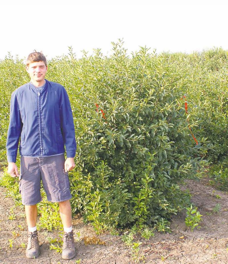 Peter Reimer, from the University of Saskatchewan�s Fruit Program, stands in front of a Dwarf sour cherry bush, which produces the largest hardy cherry on the prairies. Look for the Romance series. Cupid, shown above, is the largest of all the cherries.