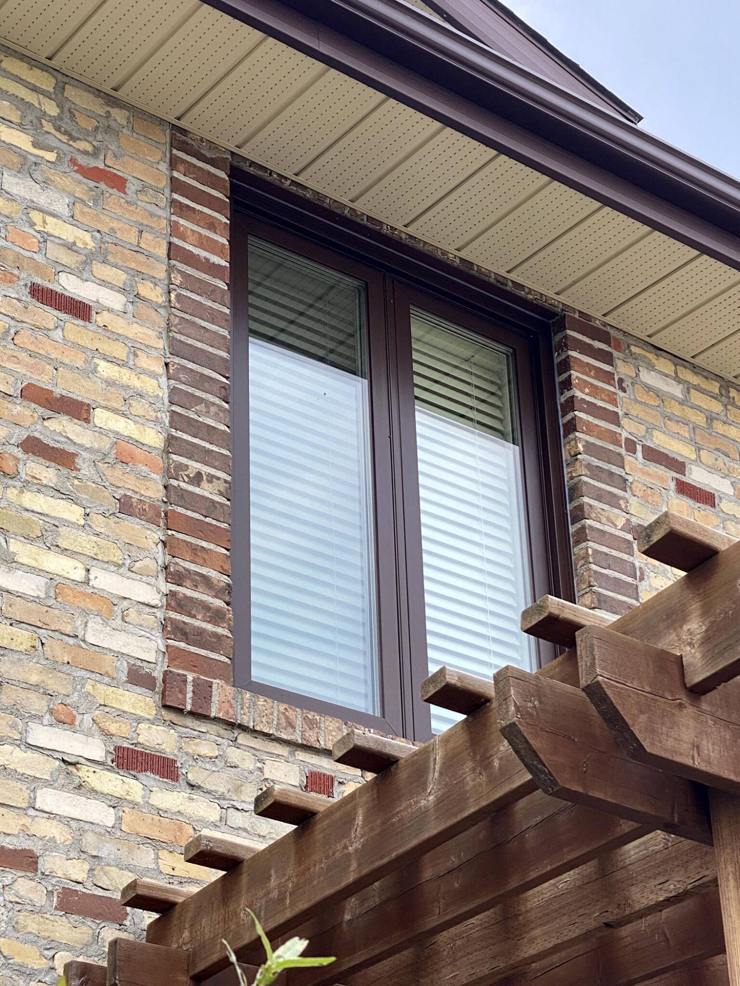 The new maintenance-free Voyageur window unit (left) is pre-painted at the factory to match the chocolate-brown trim of the house. Fortunately, loss of the vertical mullion on the old wooden unit allowed reuse of venetian blinds, despite the narrower width of the jamb.