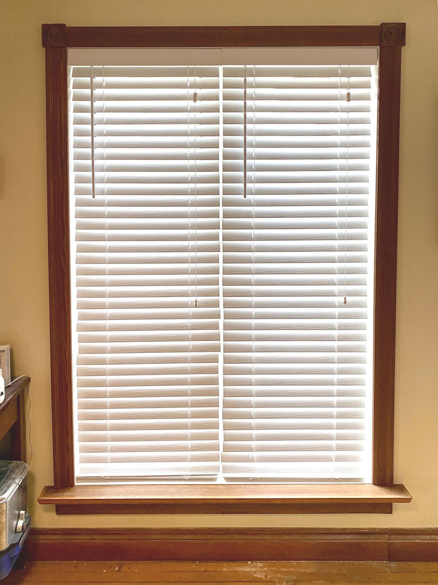 Window coverings can be a monumental expense. The old window units had been fitted with very inexpensive white, faux-wood two-inch venetian blinds within every vertical window pair — that’s a lot of blinds for all 11 windows.