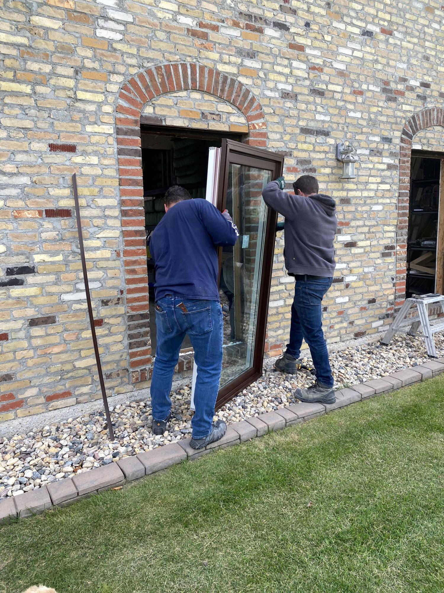 The Overcode crew positions a new unit within the existing rough opening of sandstone brick.