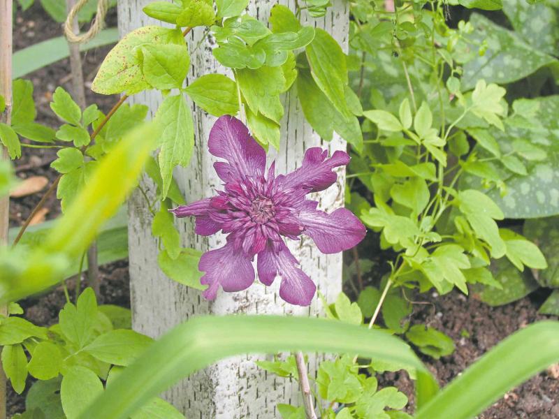 Brimming with health and no sign of fungal infection, Mielitz' clematis benefits from its pole-type of support that promotes good air circulation. The shaded soil surface limits any root stress.