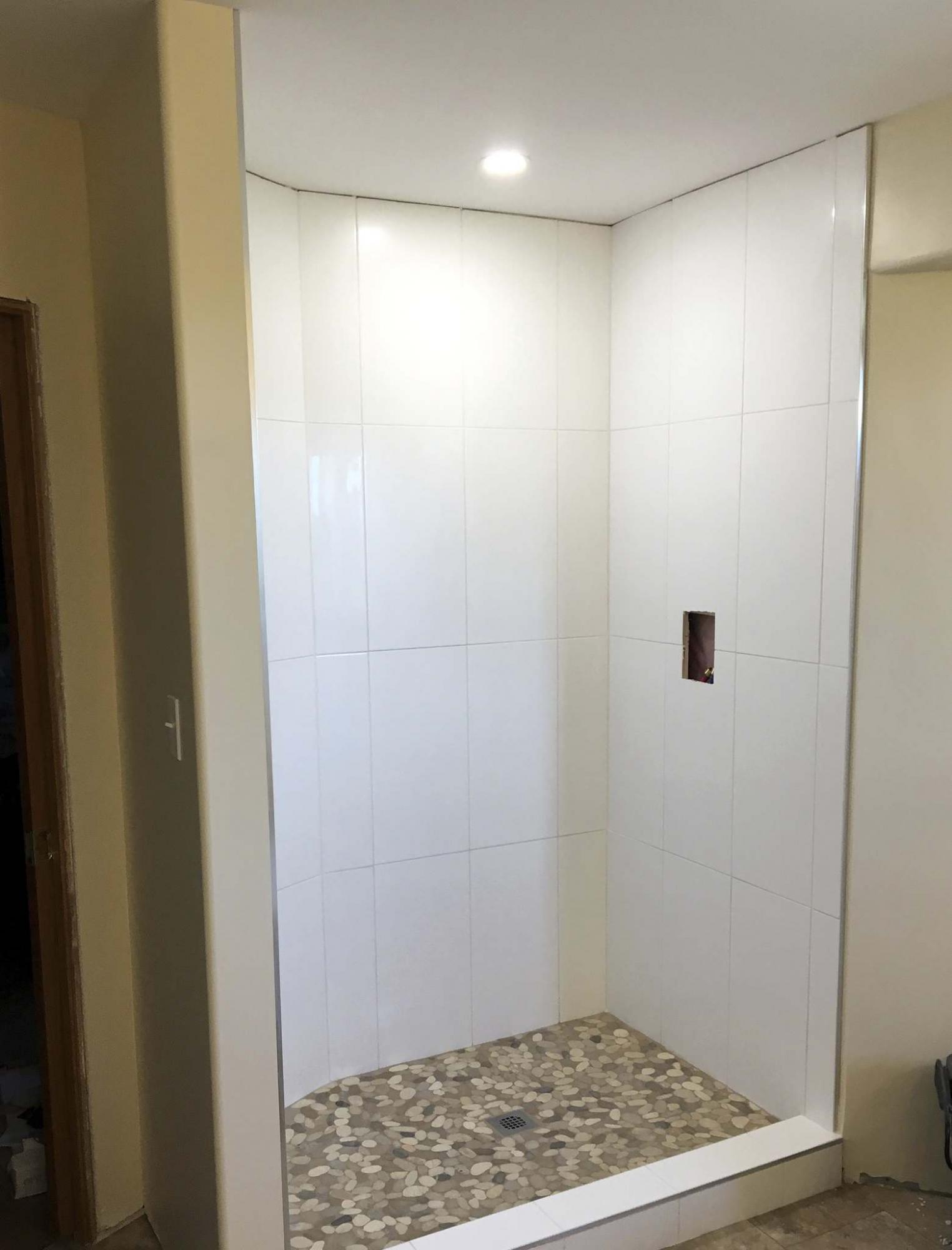 The shower stall is first fully tiled, preserving the water feed access hole before the shower column is installed.