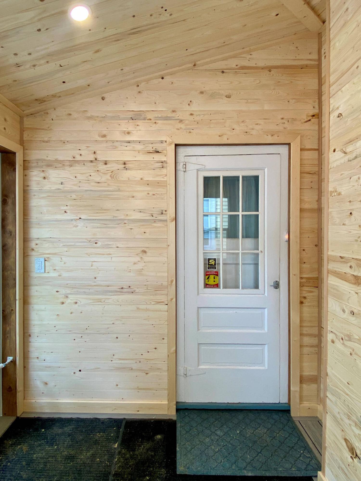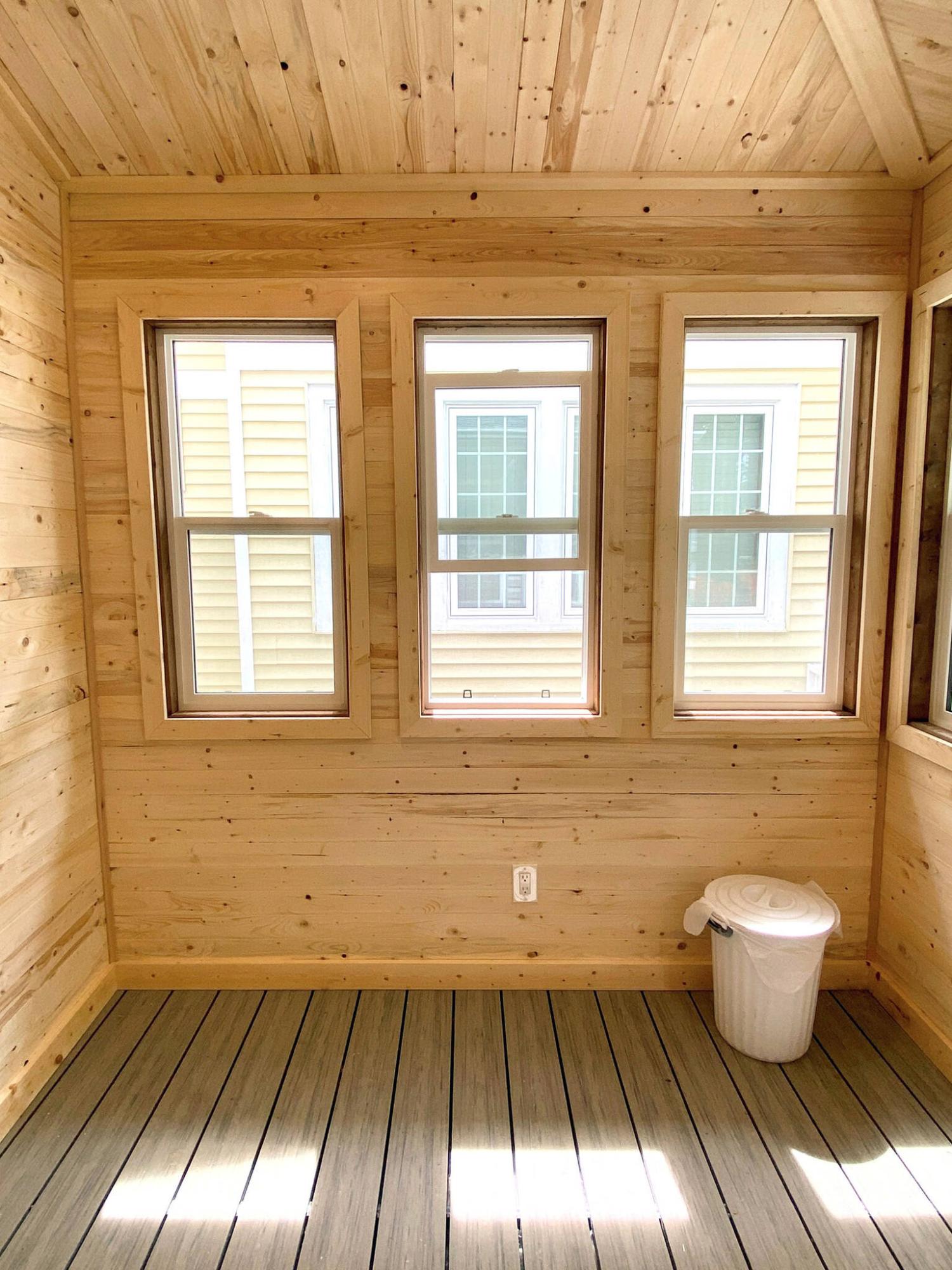 As such, the wall and ceiling cavities (along with the underside of the deck tier) were filled with batt insulation to help retain of modicum of heat during the colder months, with pine boards and trim installed on every wall surface, as well as the underside of the cottage roof.
