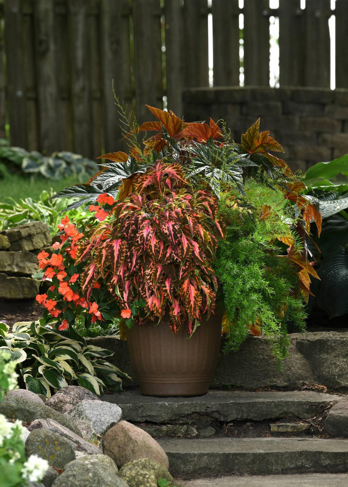 Asparagus fern adds soft, feathery texture to container designs. New Asparagus FuzzyFern Frizz from PanAmerican Seed is adaptable to shade or partial sun and has a mounded habit with trailing foliage. “We trialed it last year and found it to be more compact than other asparagus ferns,” says Van den Ham. Interestingly, FuzzyFern Frizz was bred to provide growers with a more reliable supply of Asparagus densiflorus Spengeri seed with higher germination. Van den Ham thinks that FuzzyFern Frizz will offer more versatility for gardeners. “It could go into a hanging basket and not take over.” An attractive combination for a container garden would be Asparagus FuzzyFern Frizz with Gryphon Begonia, Beacon Orange Impatiens, and an upright coleus such as Marble Mania or Premium Sun Coral Candy Coleus which was a 2023 All-America Selections Winner.