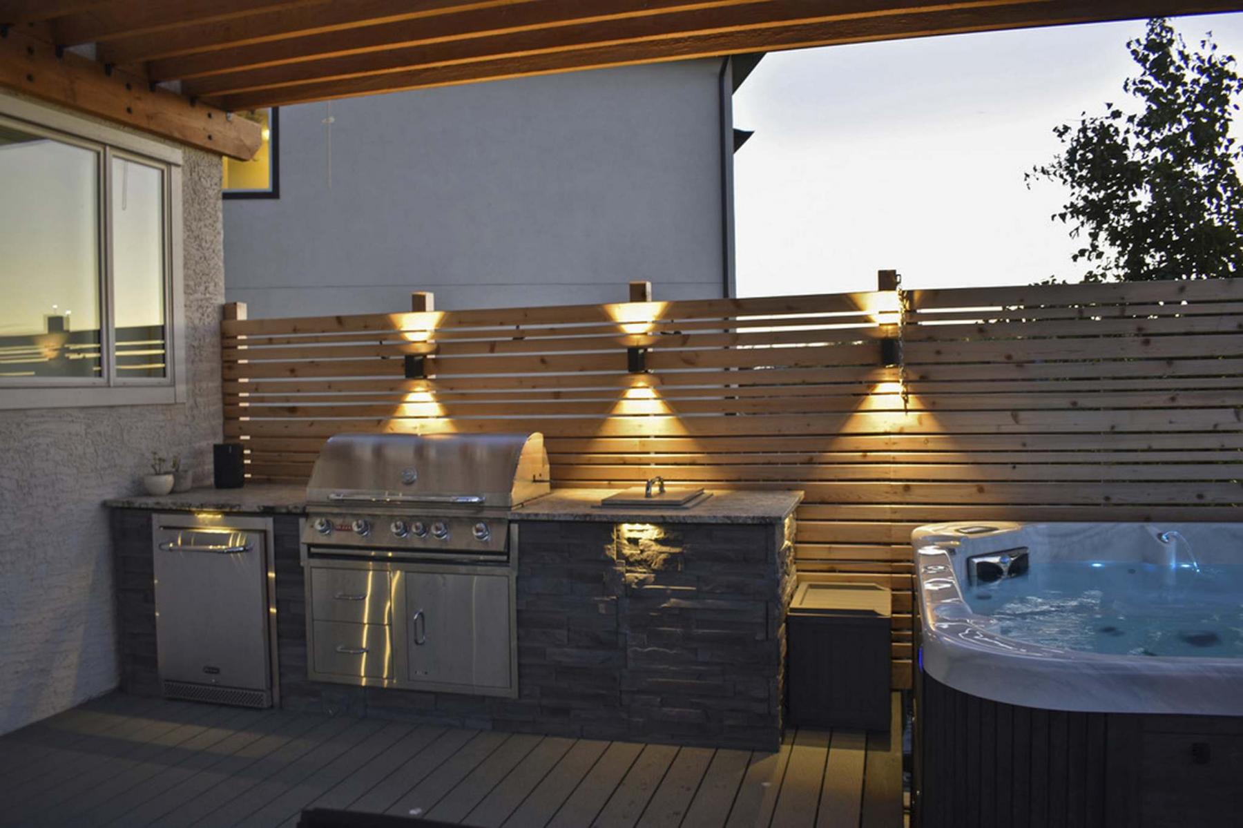 A covered grilling station and seating area offers protection from the elements. A cabana is a covered open-air structure that is gaining in popularity, says Bell. This type of structure is more expensive than a pergola because the roof is more expansive and is engineered to hold snow loads. Bell and his experienced team at Gellers which includes Michael Patton and Braedon Guenther, foremen, and Brandon Sutherland, project manager, typically build the wooden frames for cabanas out of cedar, treated lumber, or Douglas fir.